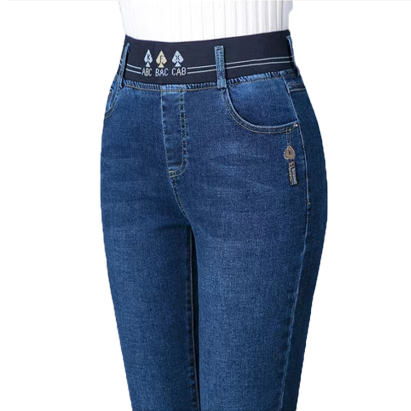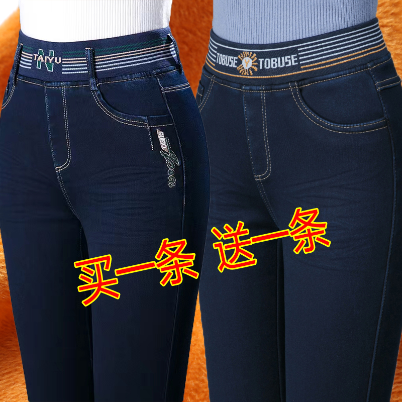 松紧腰加绒牛仔裤女高腰弹力直筒加厚裤子带绒保暖大码中老年女裤