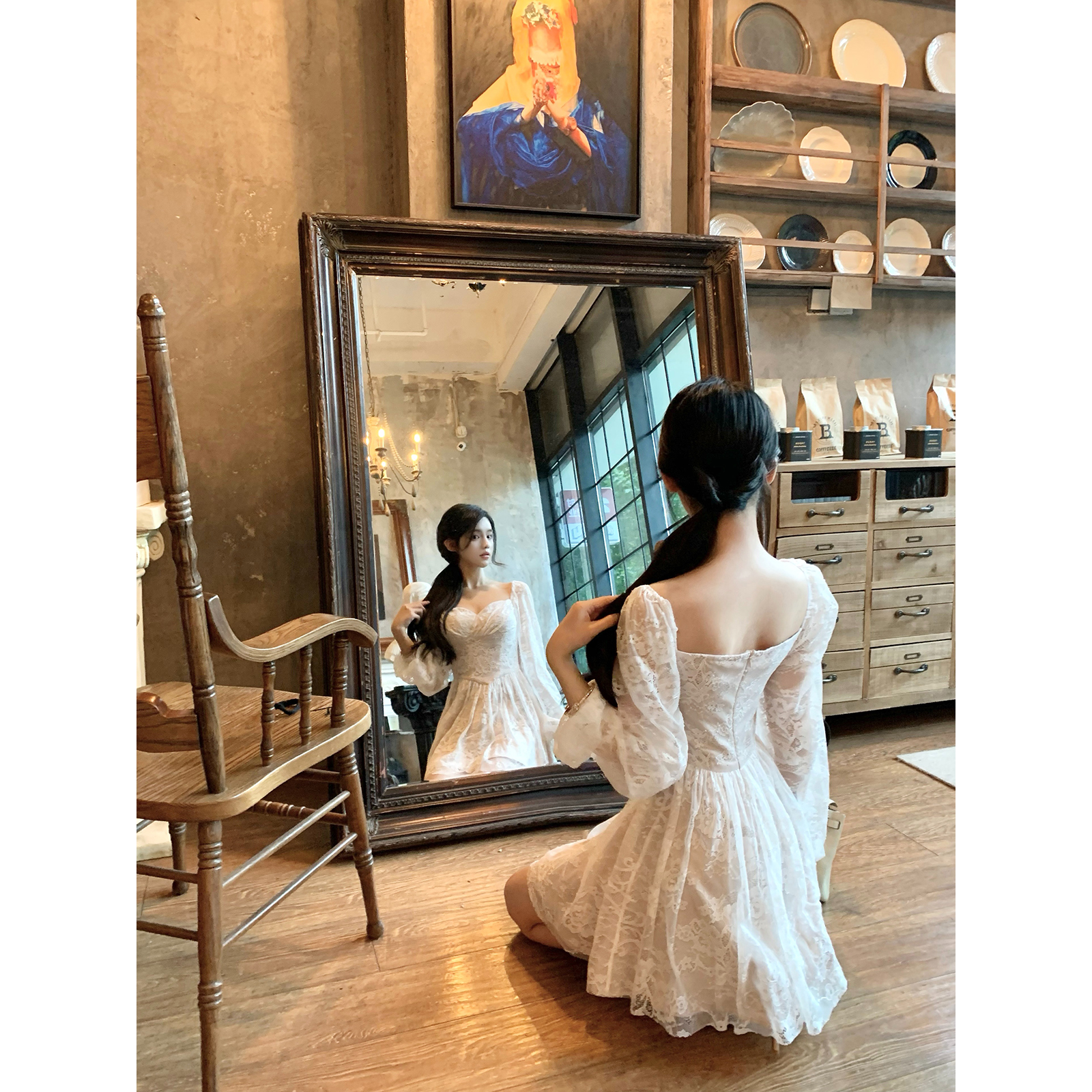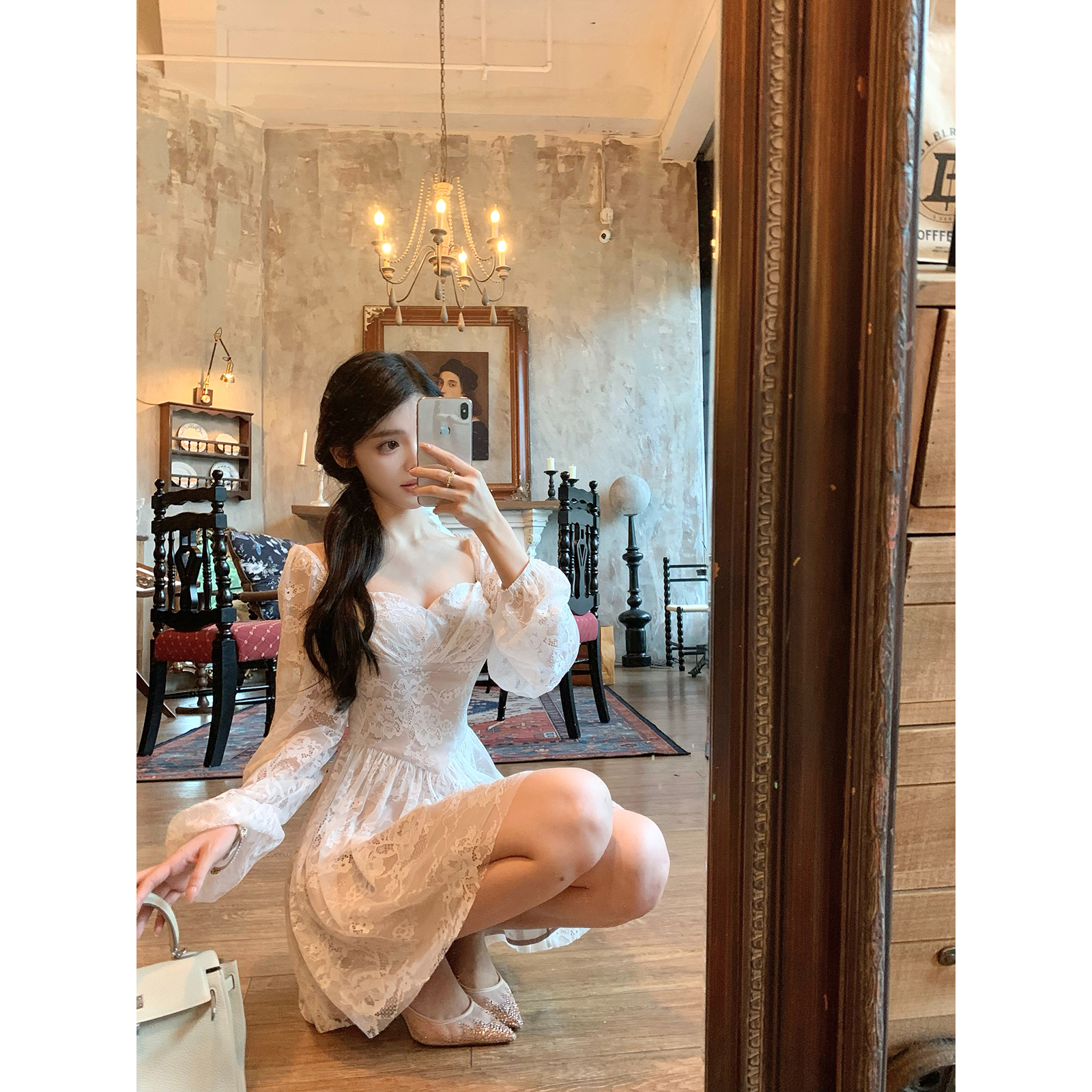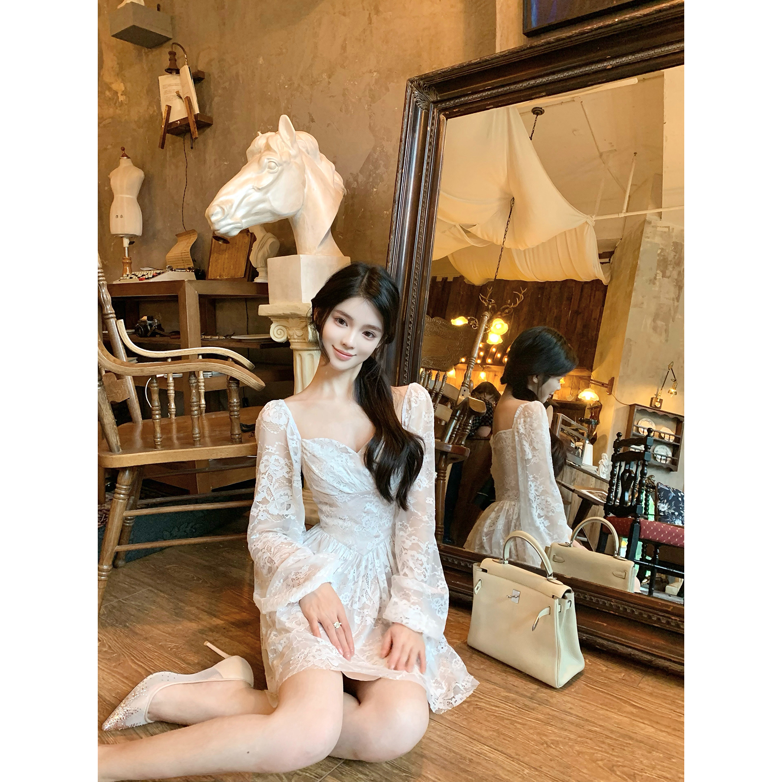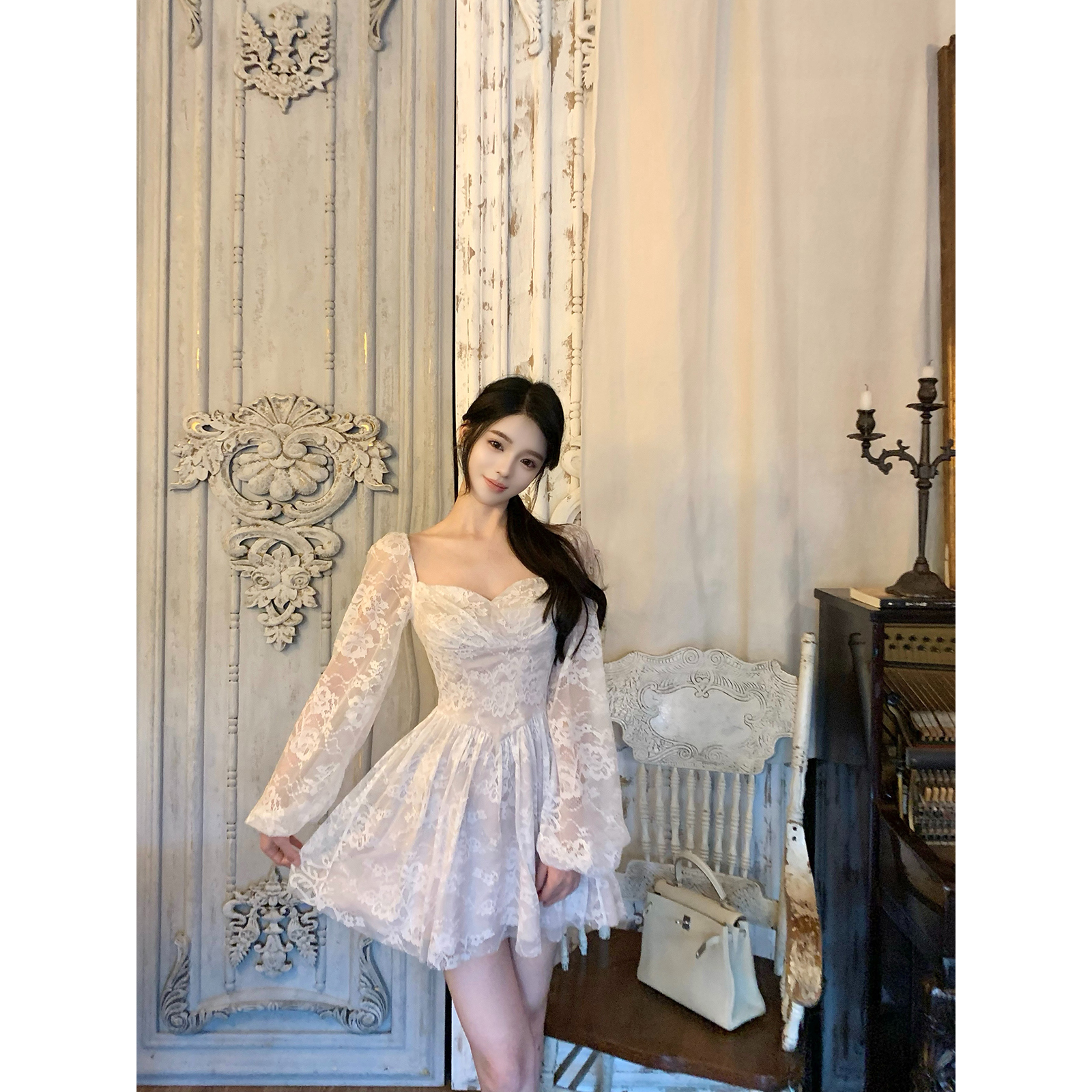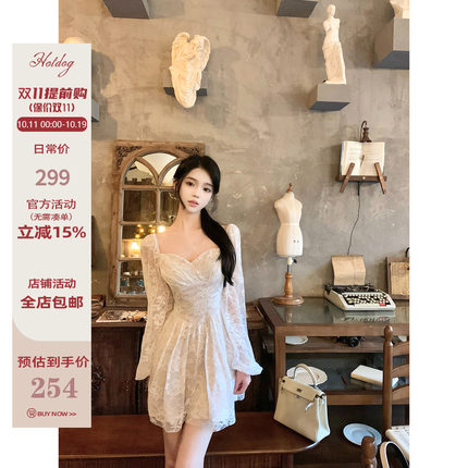 Hotdog 热狗很辣【月漫花蕾】温婉优雅气质白色长袖收腰连衣裙女