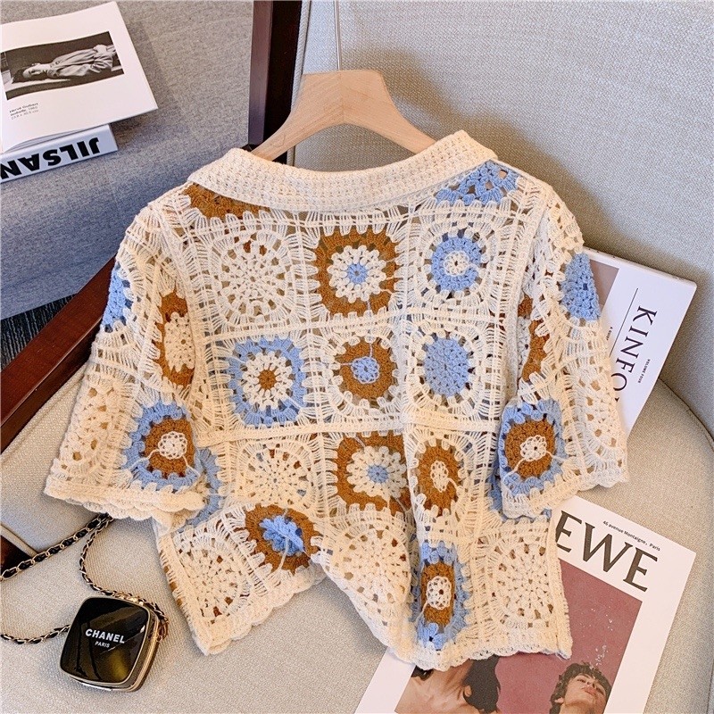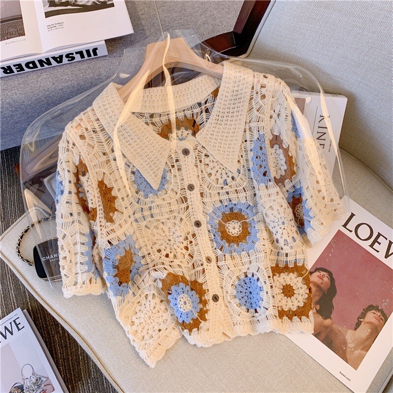 2025早春性感镂空针织衫短款上衣女高级感法式毛巾绣短袖网红衬衫