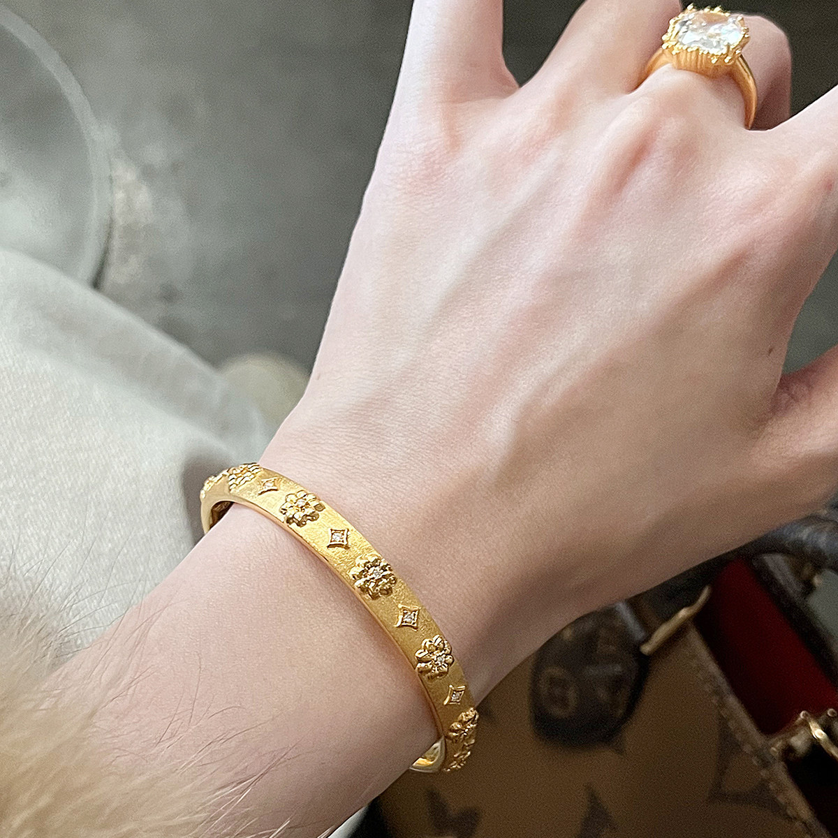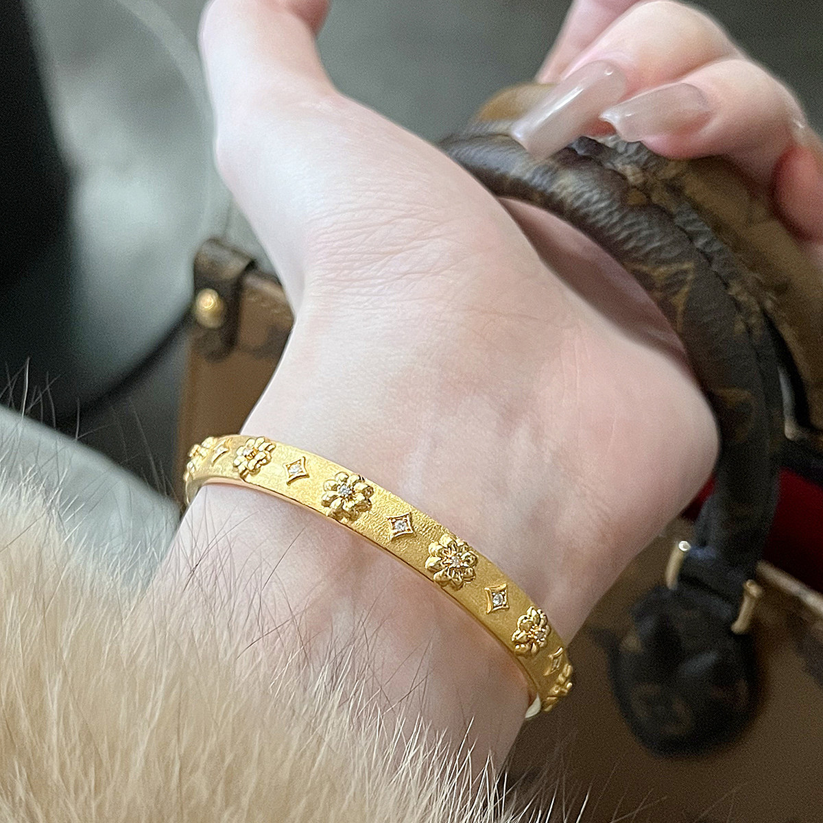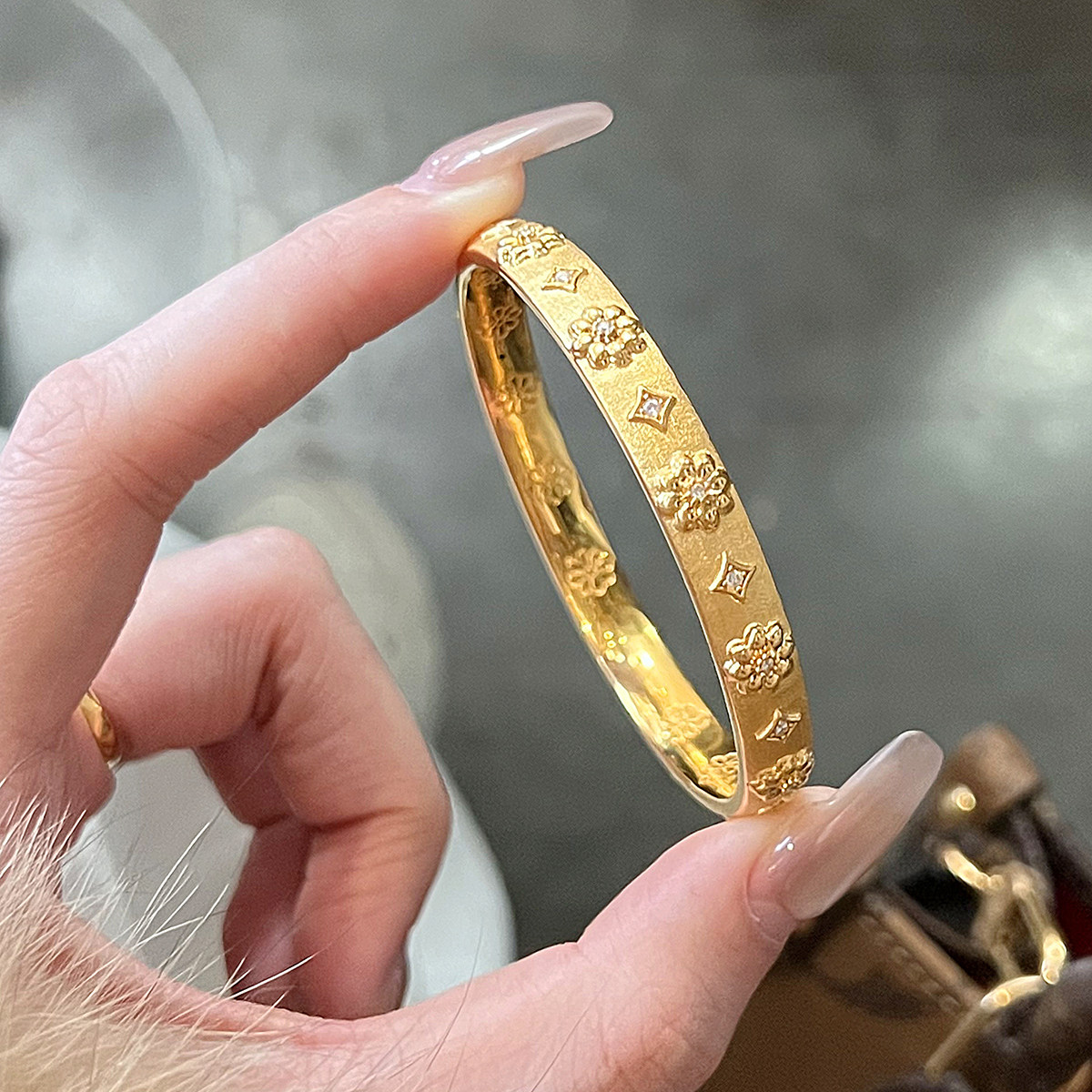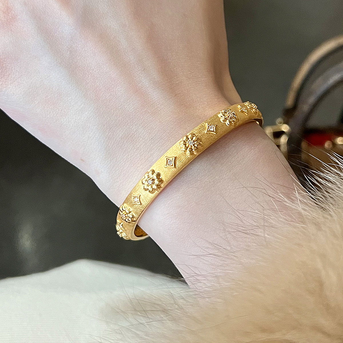 吉盟珠宝5D点钻黄金闭口手镯子足金999中古花卉时尚高级感送女友