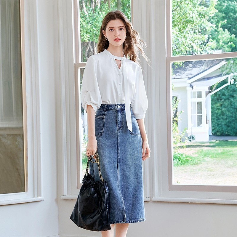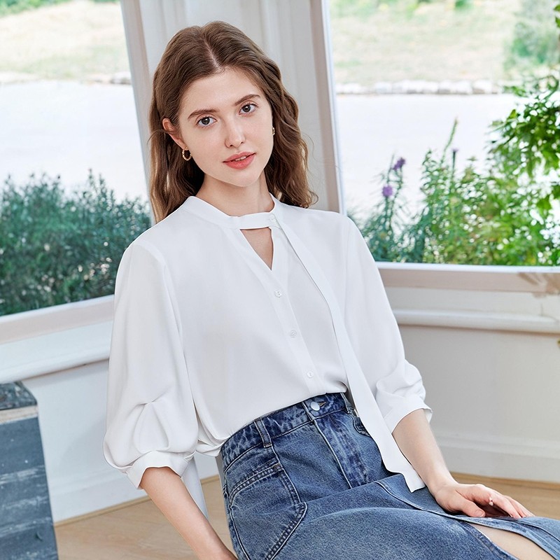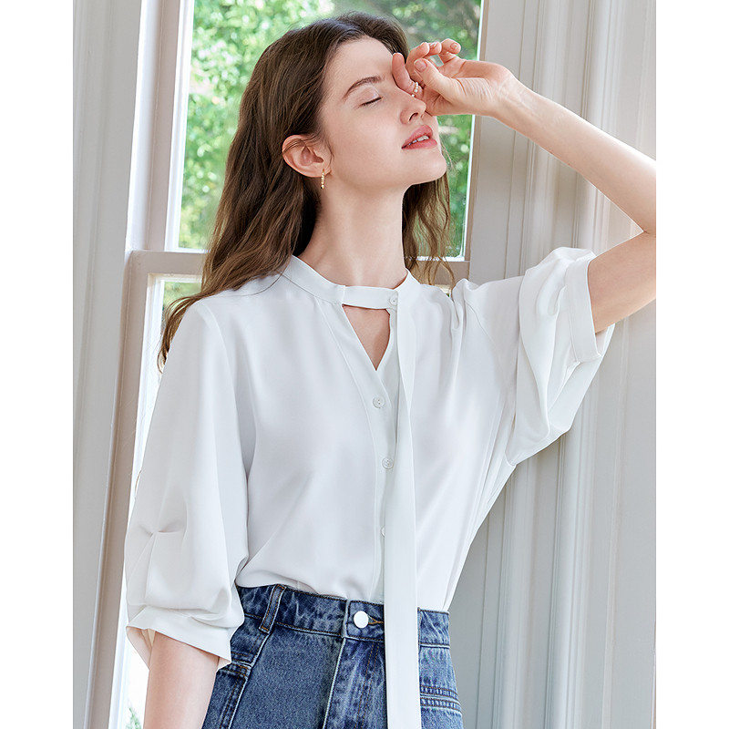 betu百图设计感系带灯笼袖白衬衫女2025年夏季新款七分袖雪纺衫