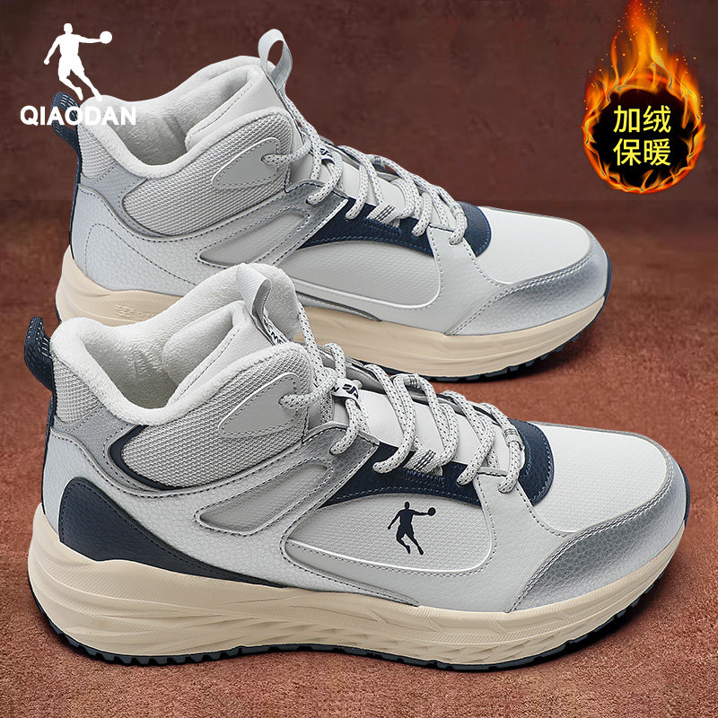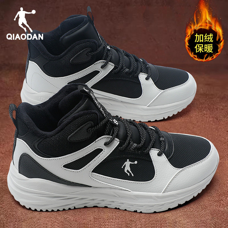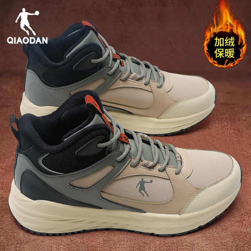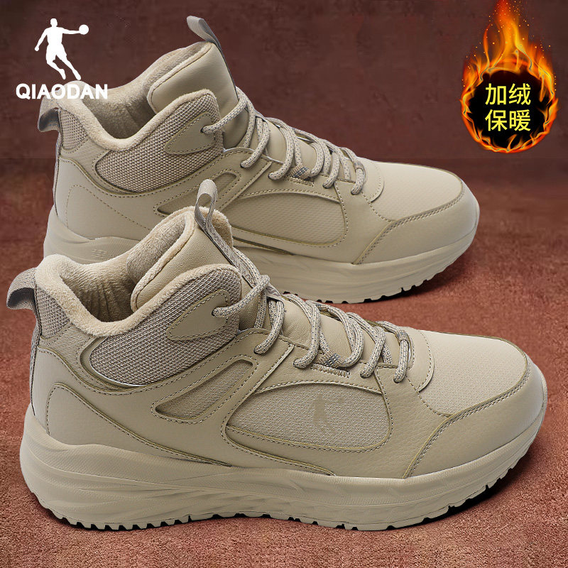 乔丹男鞋加绒棉鞋冬季新款加厚防寒雪地靴皮面黑色高帮厚底运动鞋