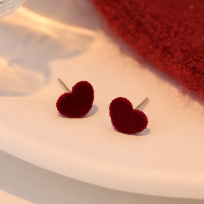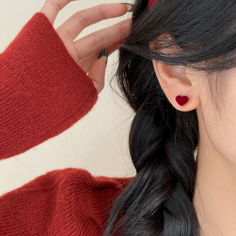 S925纯银丝绒红色爱心耳钉轻奢高级感气质喜庆2025本命年爆款耳饰