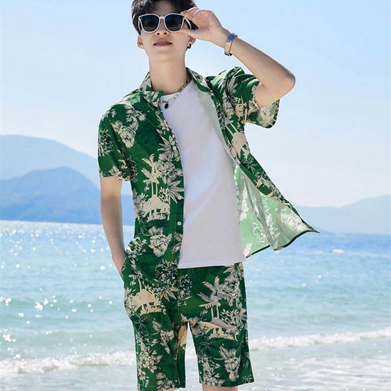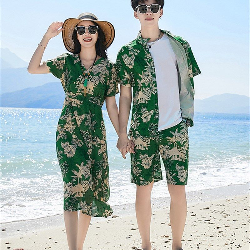 海边度假亲子装夏季短袖一家三口2024新款沙滩母女连衣裙花衬衫潮