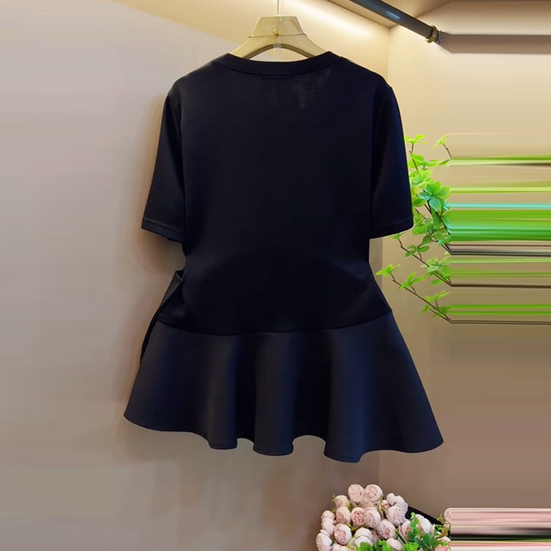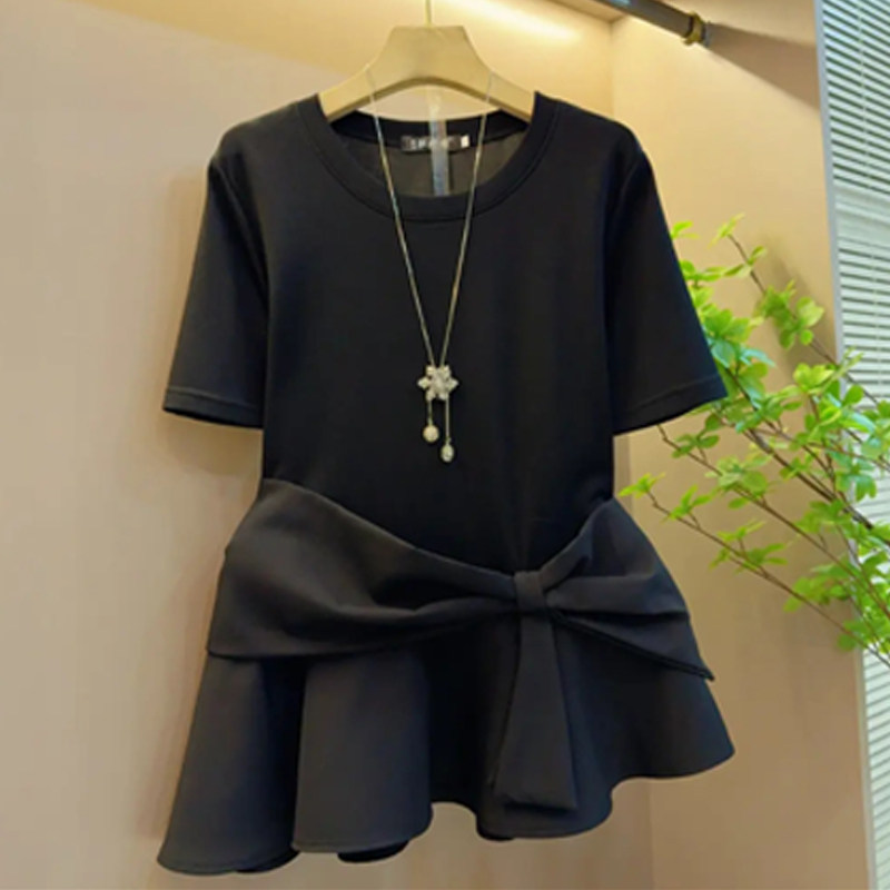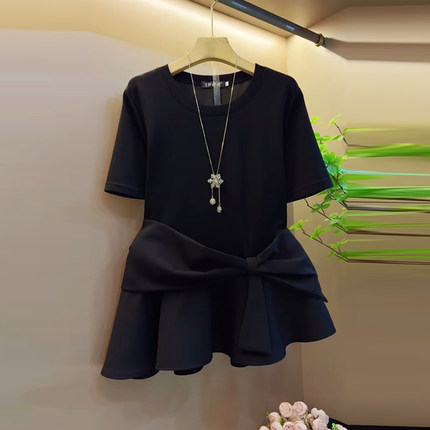 胖MM加肥蝴蝶结腰圆领短袖T恤衫大码女装法式夏季款黑色百搭上衣