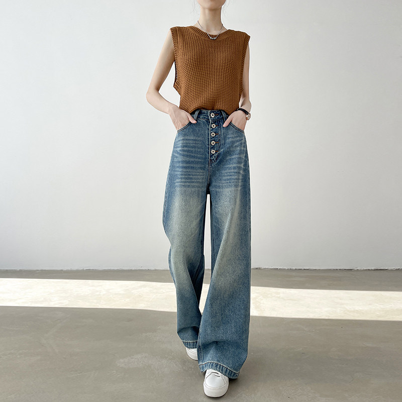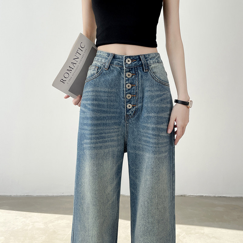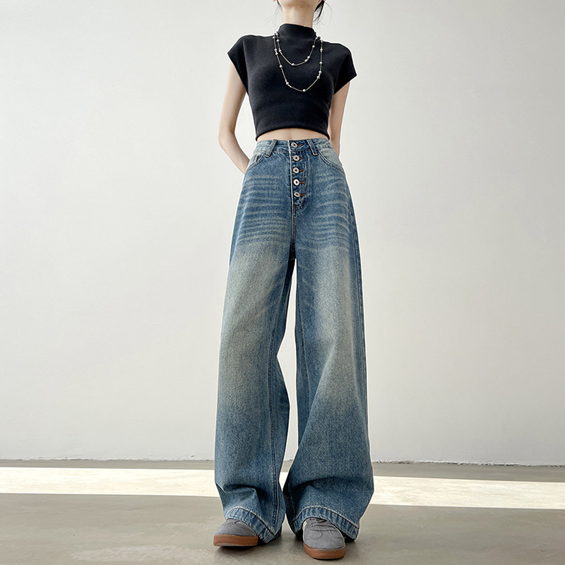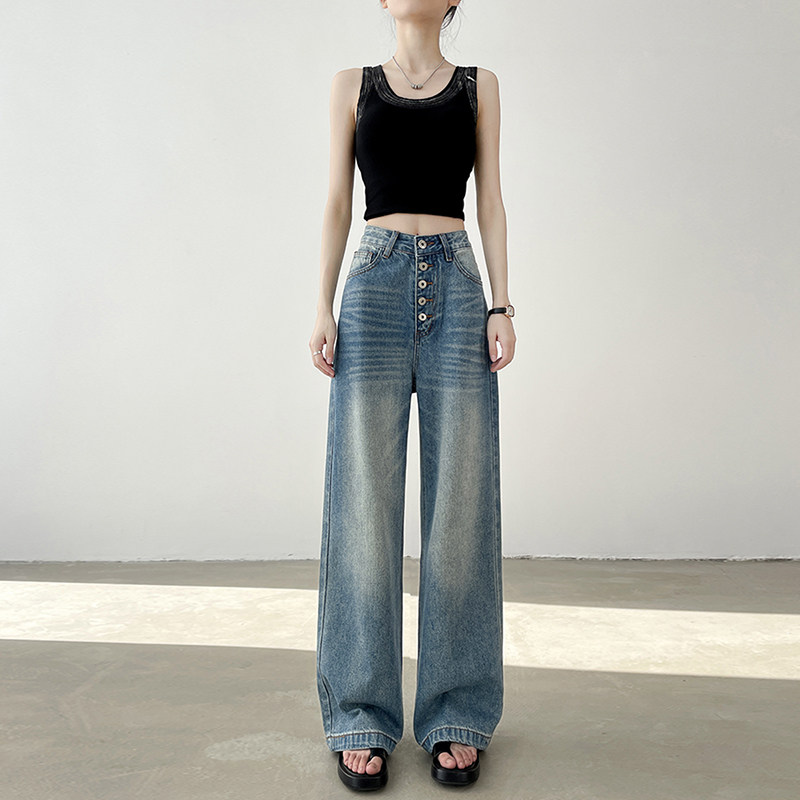 美式排扣水洗阔腿牛仔裤女春季新款高腰垂感显瘦宽松复古直筒长裤