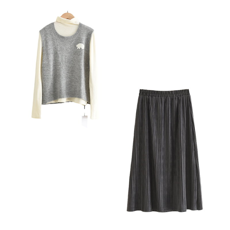 伊系の2023冬时尚圆领针织马甲叠穿高领舒适打底衫半身裙三件套装
