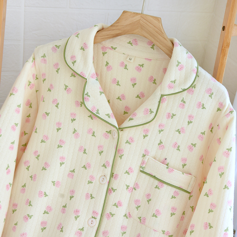睡衣女秋冬季空气棉三层夹棉保暖加厚长袖套装冬天薄款纯棉家居服