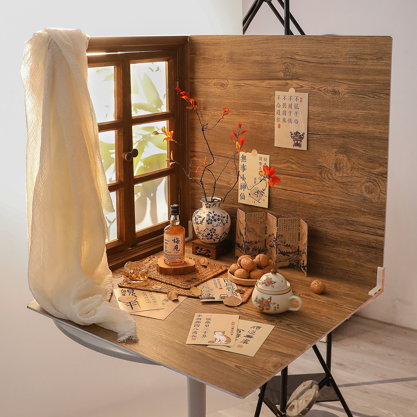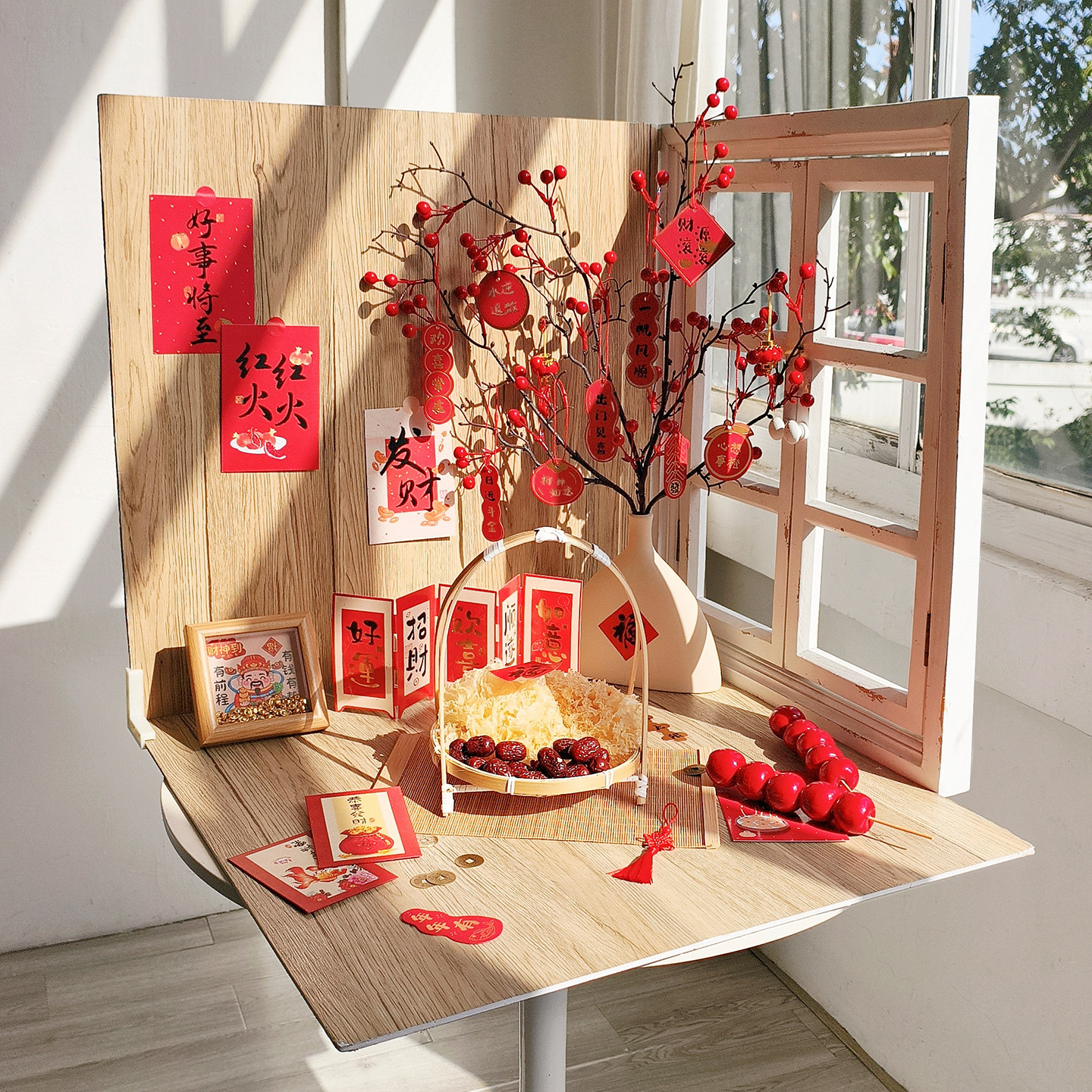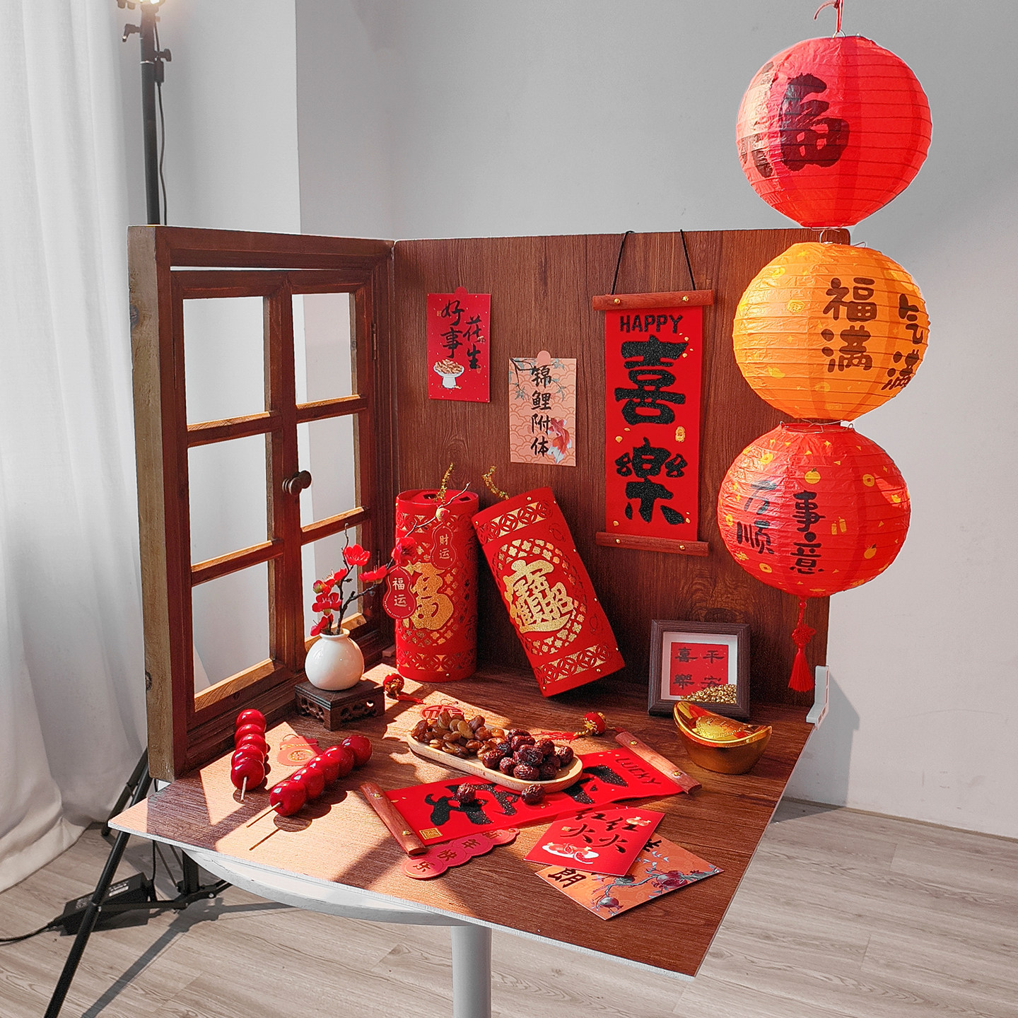 新年装饰拍照道具假窗户造景复古美食高级氛围感拍摄场景布置红色对联糖葫芦小摆件搭建一整套木纹摄影背景板