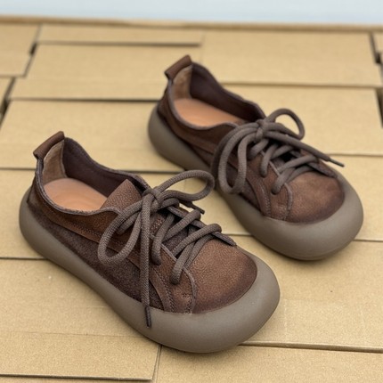 手工真皮复古妈妈鞋新款平底鞋圆头休闲女单鞋森系舒适中老年女鞋