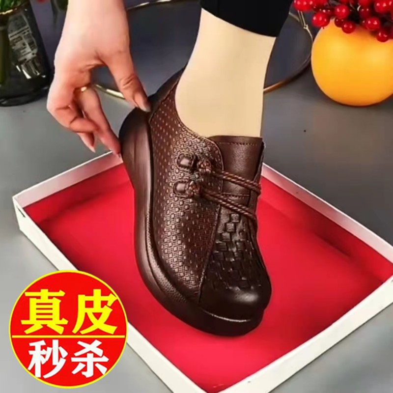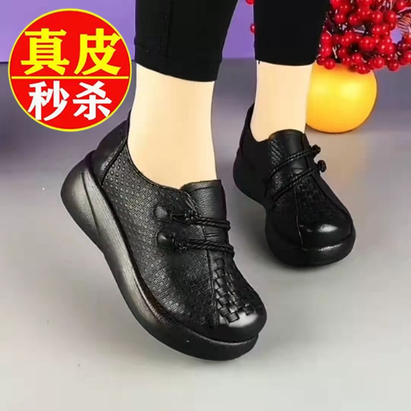 品牌鞋真皮妈妈鞋秋季新款圆头坡跟软底中老年休闲防滑复古单鞋女