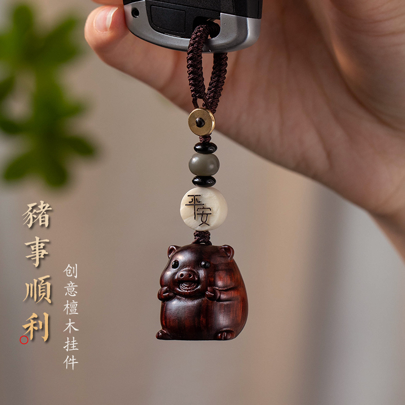 檀木猪事顺利钥匙挂件男女可爱小猪手机链生肖猪车钥匙扣包包挂饰