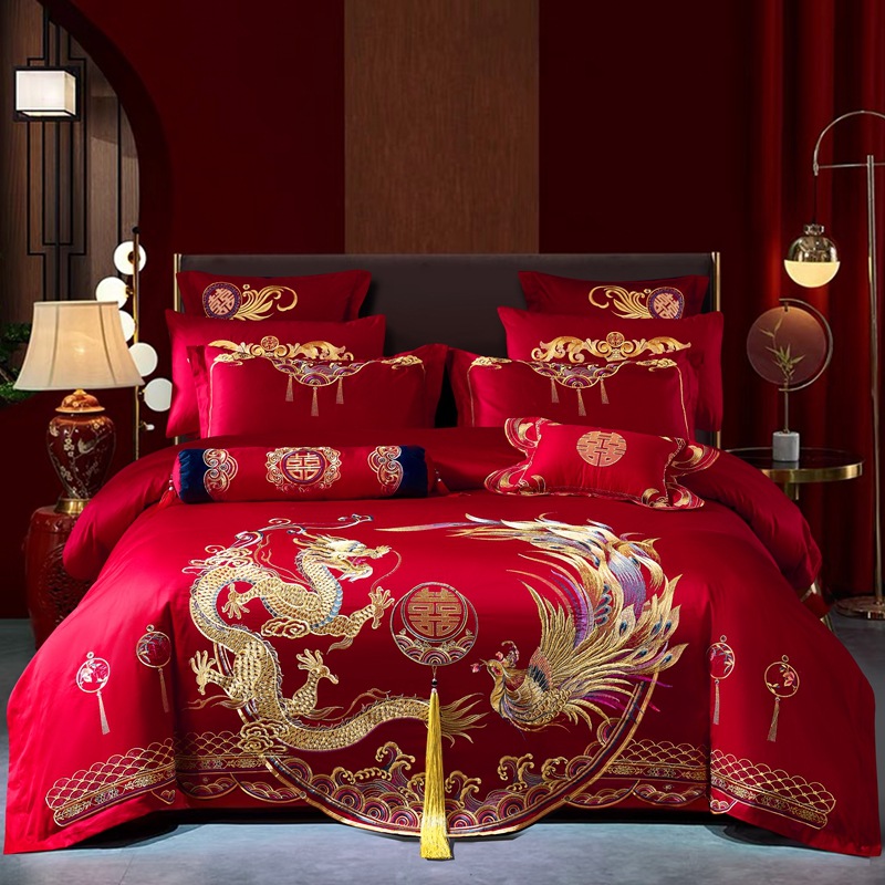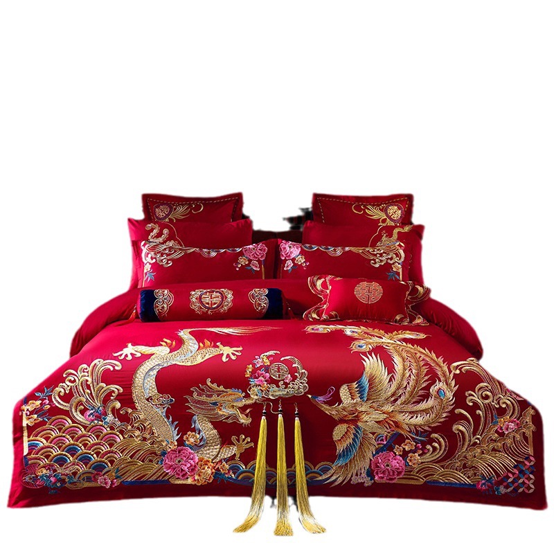 100S长绒棉婚庆结婚四件套房大红纯棉高端中式龙凤刺绣床上用品