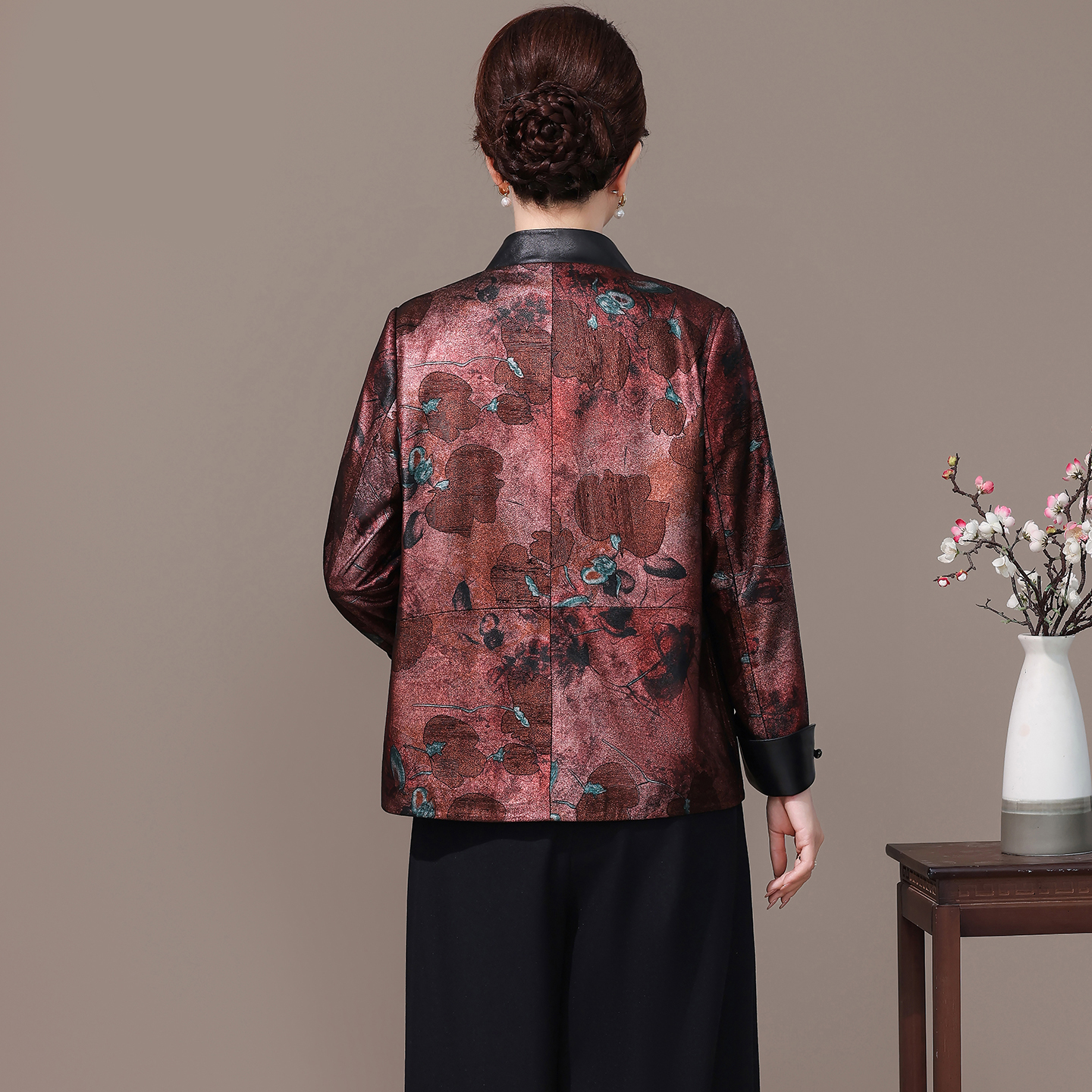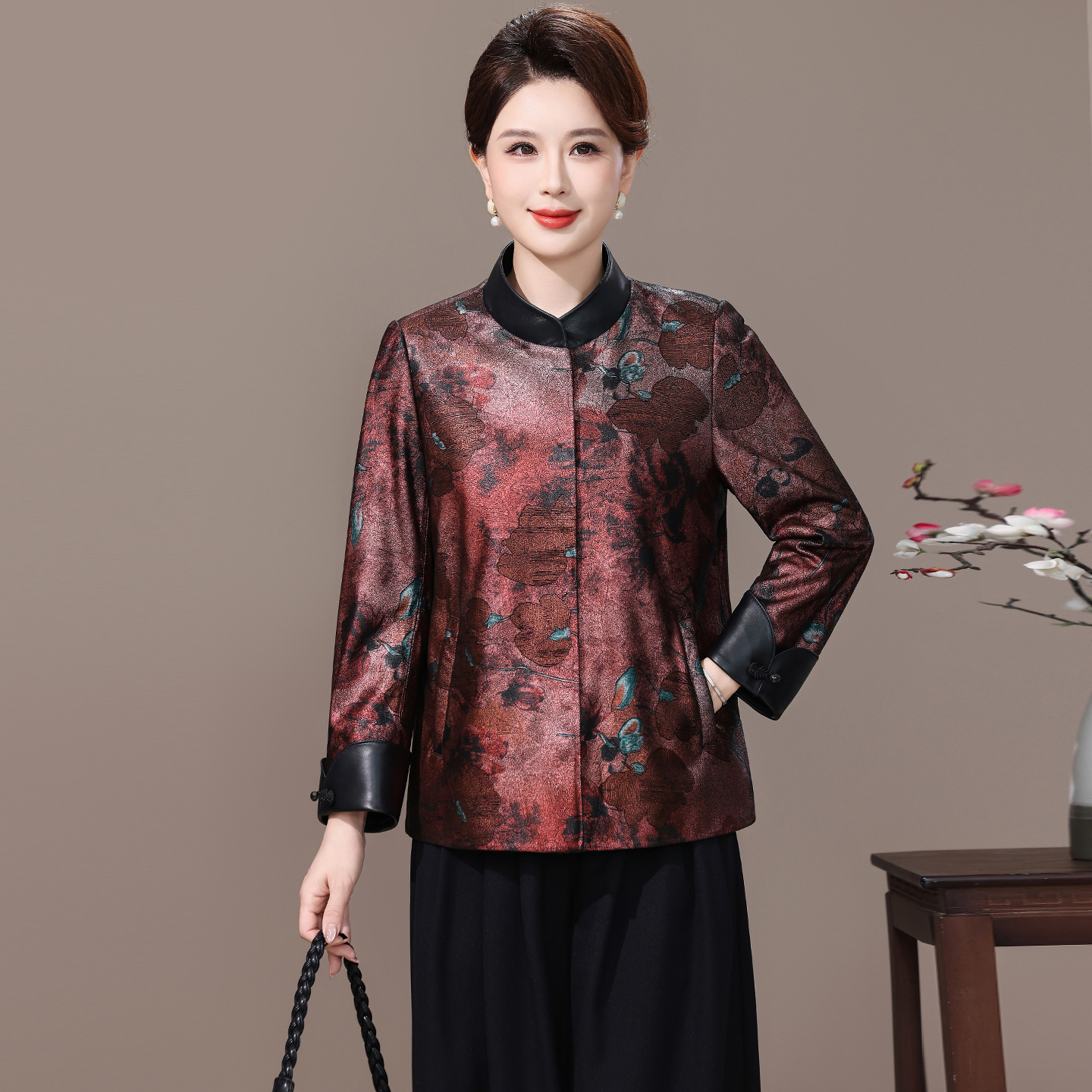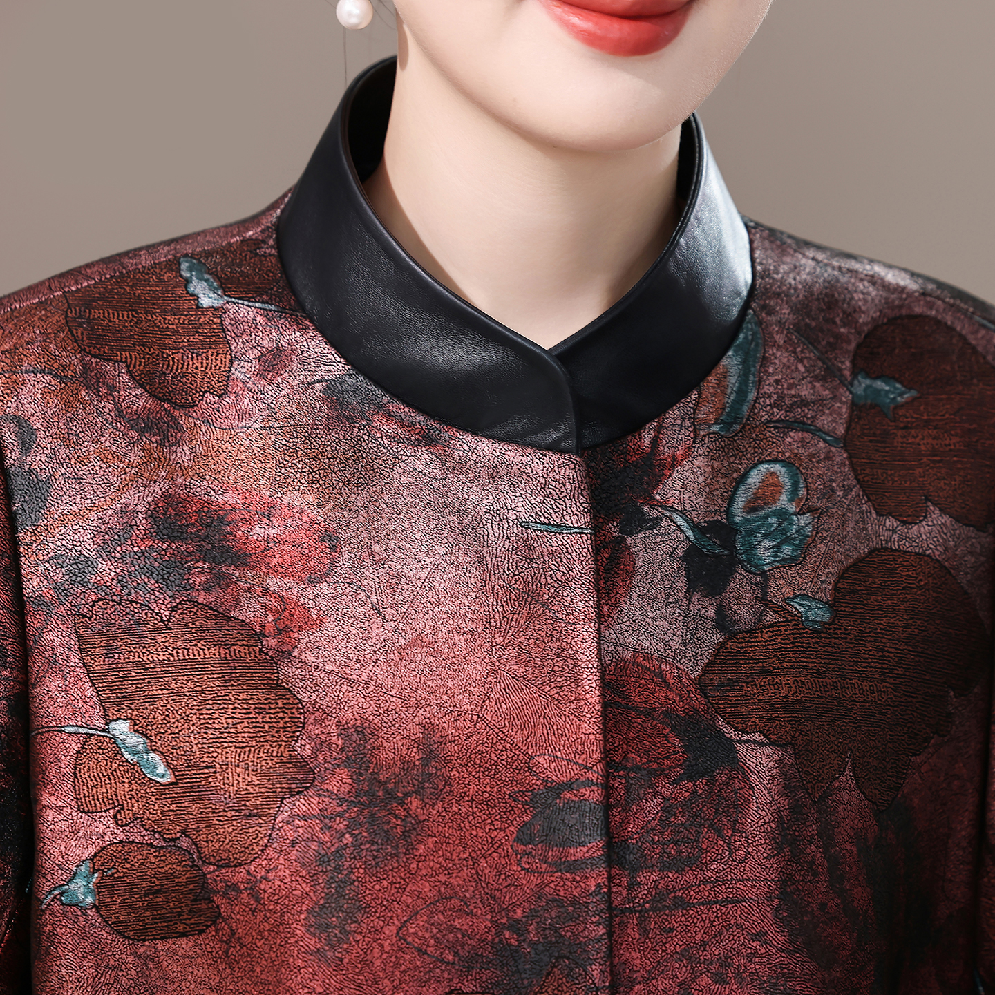 海宁真皮皮衣女2025秋季新款印花中老年妈妈装短款绵羊皮休闲外套