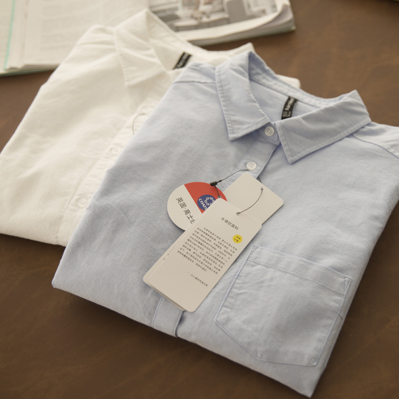 猜不透 早春休闲纯棉磨毛白牛津纺蓝衬衫女长袖通勤打底衬衣