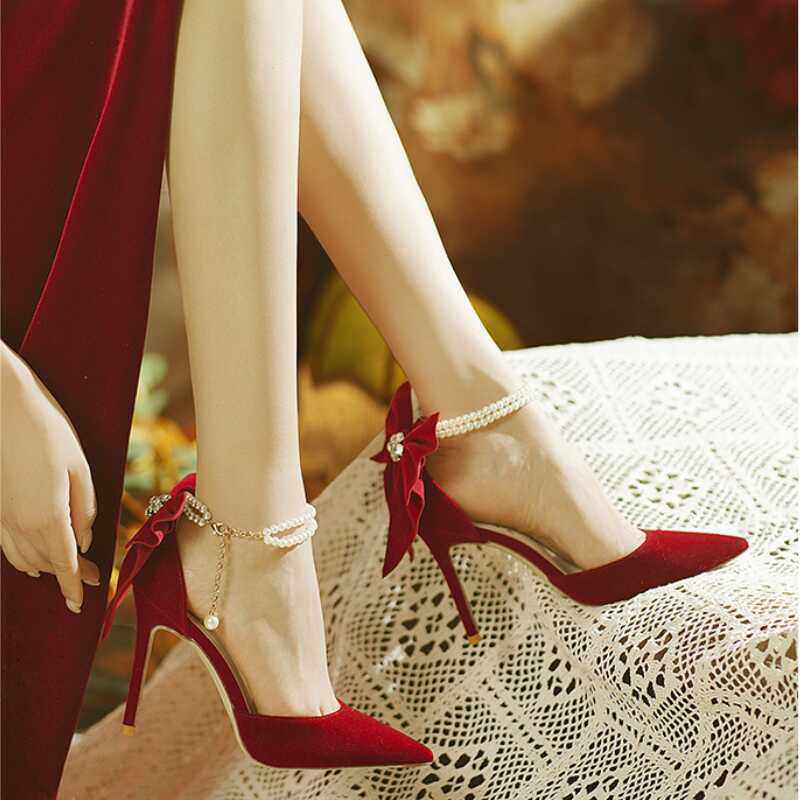 红色秀禾婚鞋细跟尖头高跟鞋女单鞋新款蝴蝶结珍珠不累脚新娘鞋
