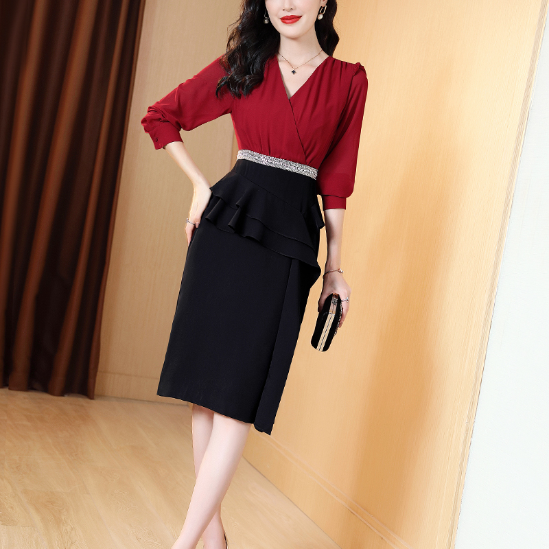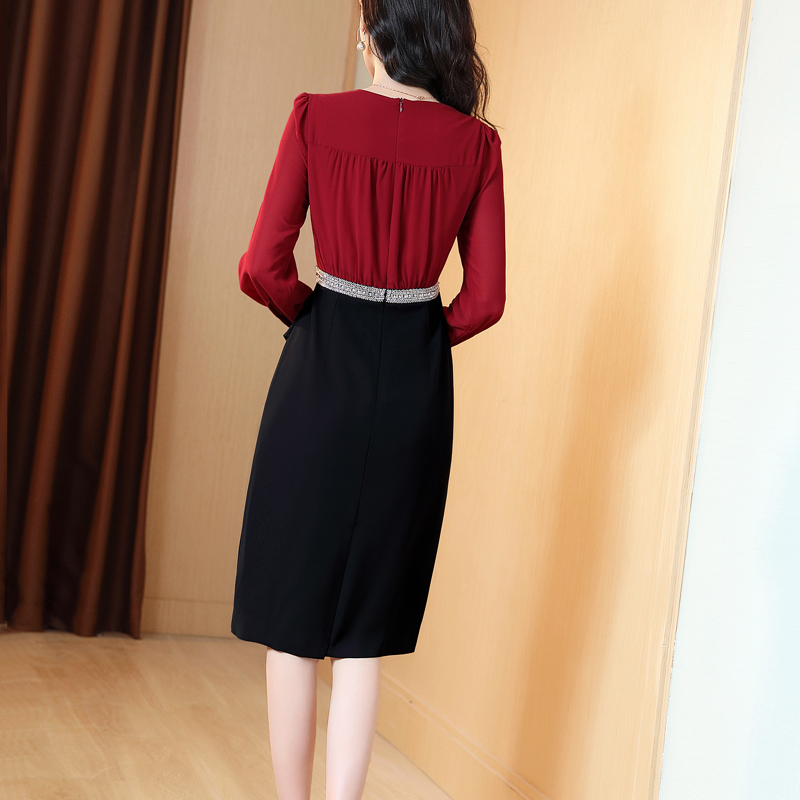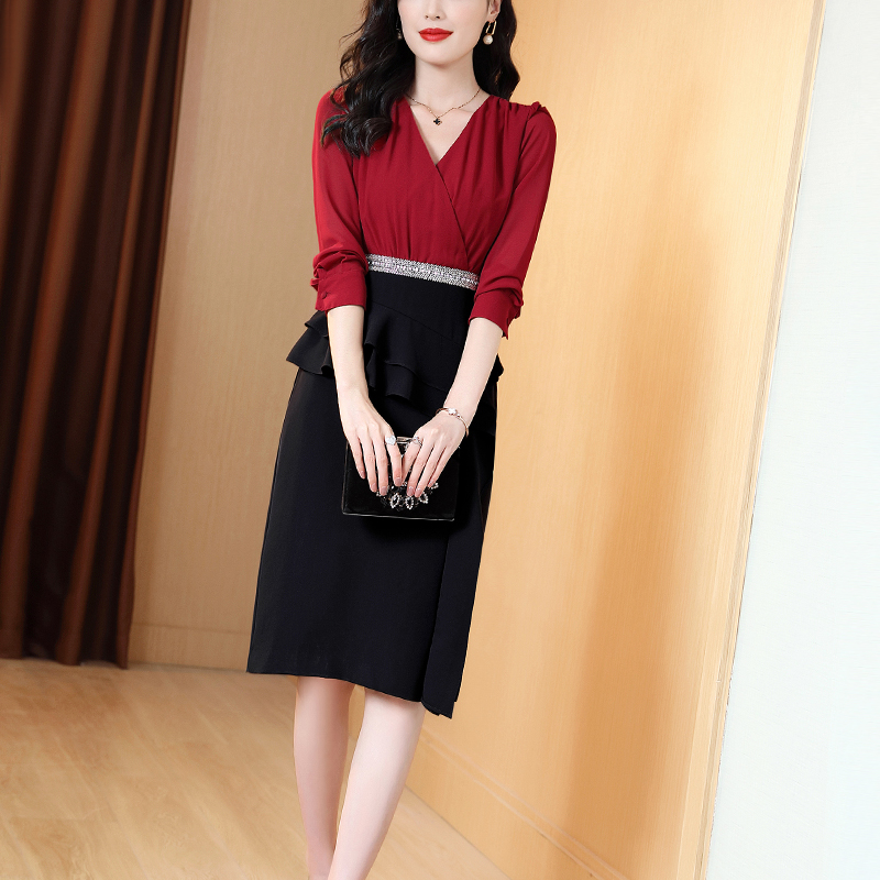 红色礼服连衣裙女长袖2025春秋新款高档职业拼接收腰包臀A字裙子