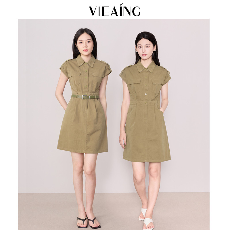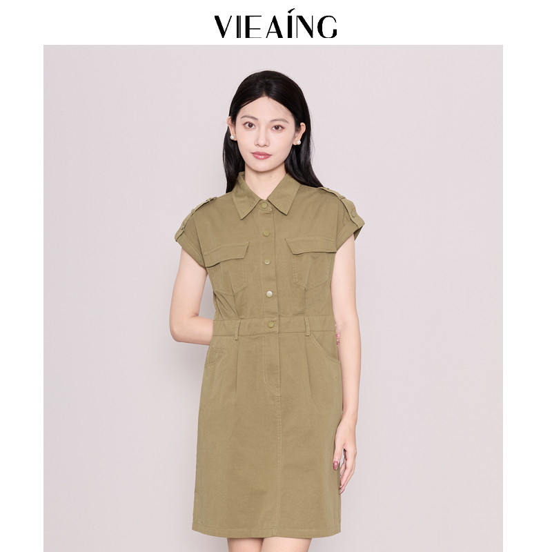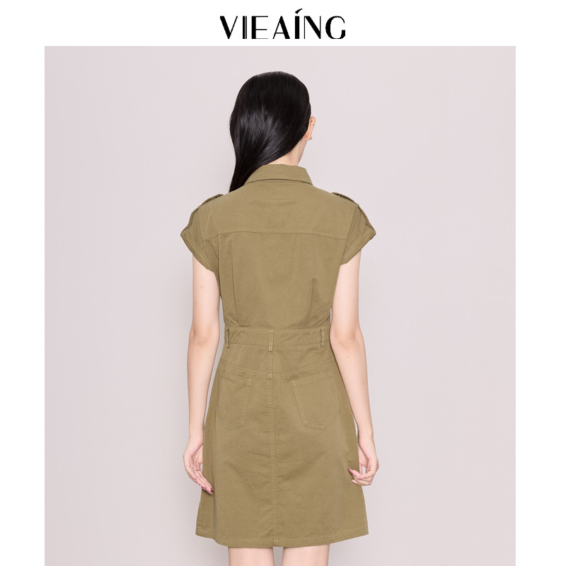 VIEA.ING薇迎商场同款工装连衣裙女2026夏新款军绿色收腰短袖裙子