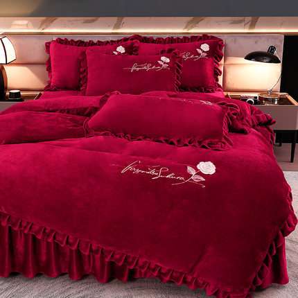 冬季牛奶绒四件套婚庆加厚珊瑚绒被套床单结婚红色双面绒花边床裙