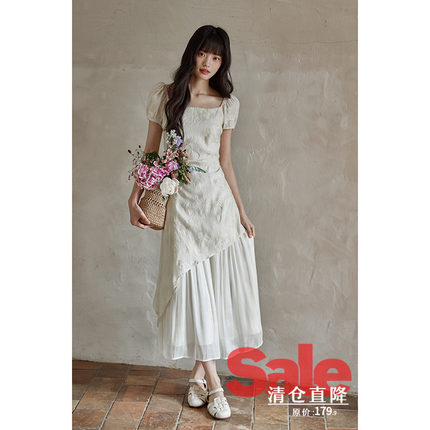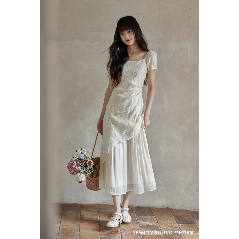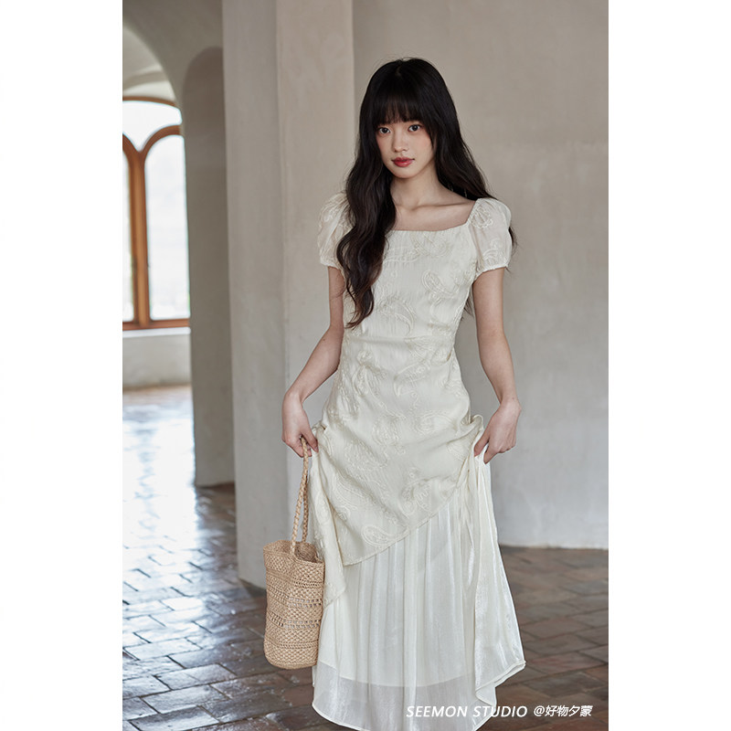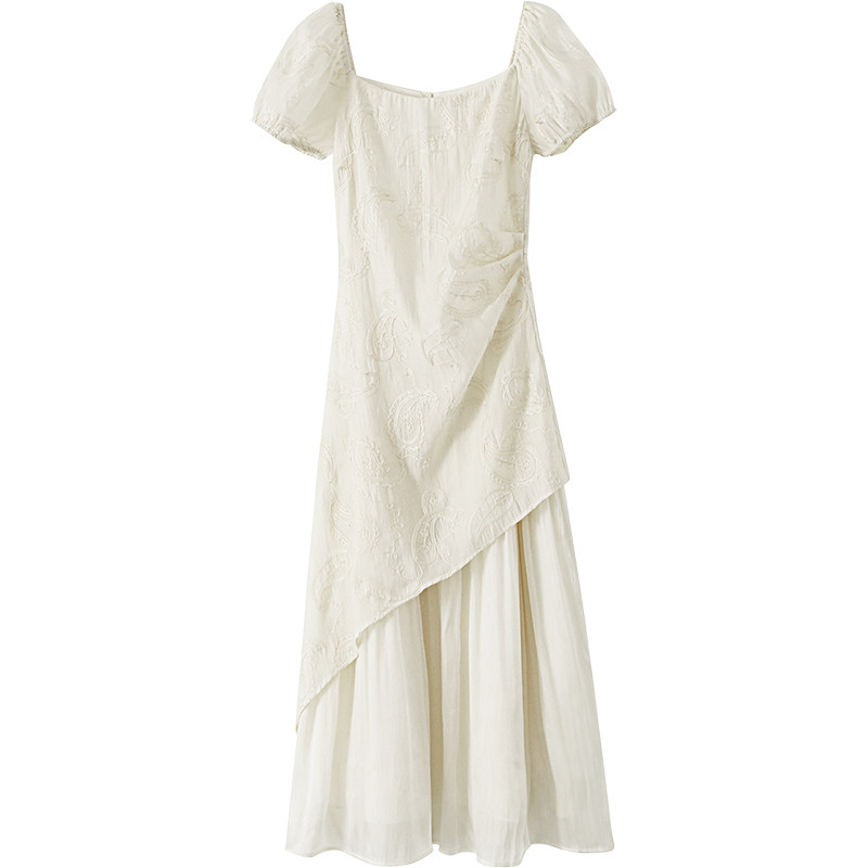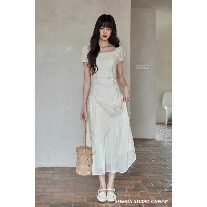 【清仓秒杀】夏法式气质裙子刺绣设计感小个子小众短袖杏色连衣裙