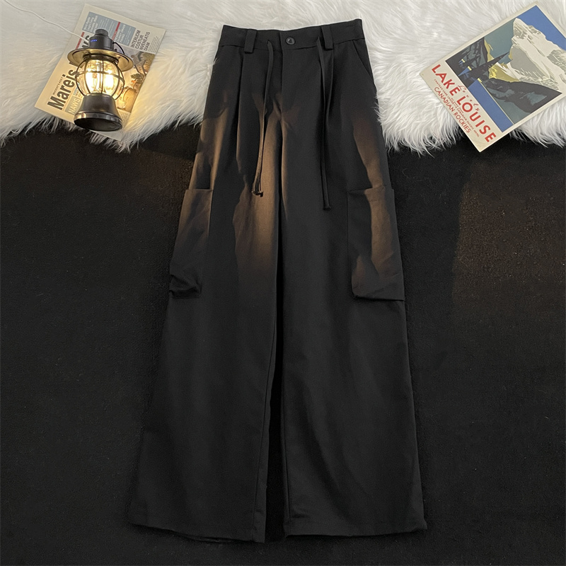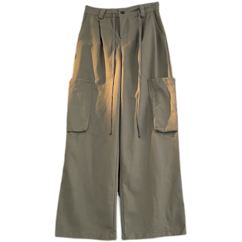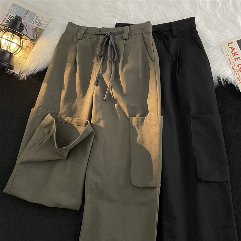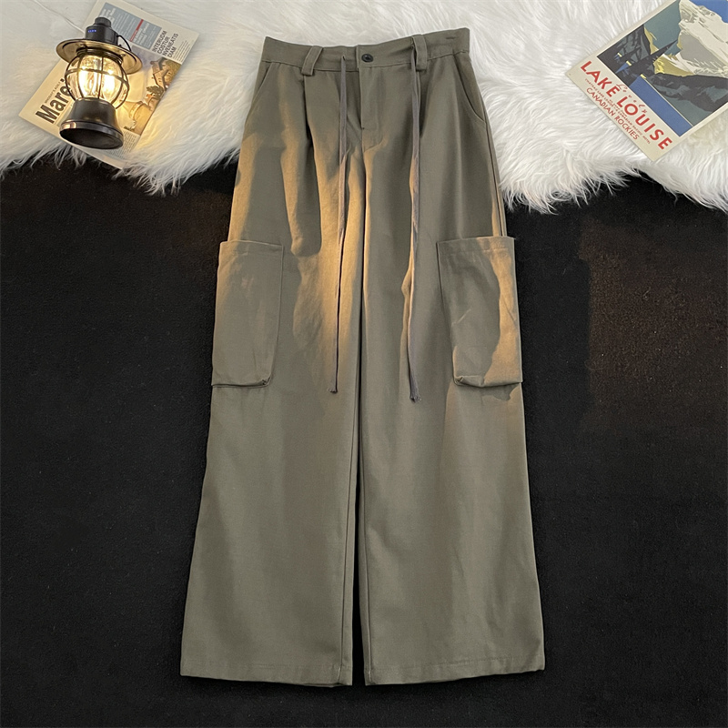 日系斜纹布半松紧腰抽绳工装休闲长裤男士潮流直筒运动阔腿拖地裤