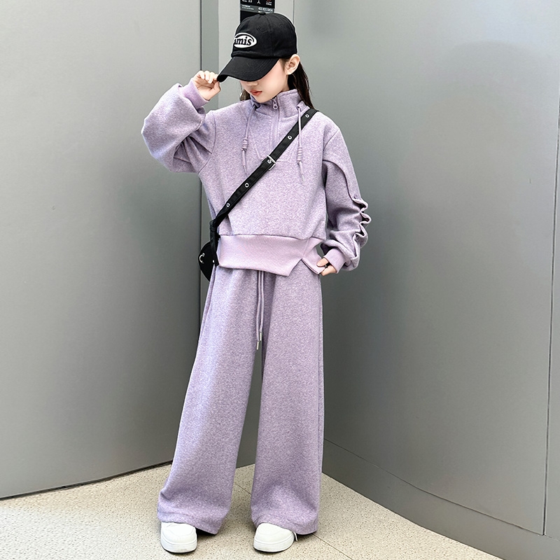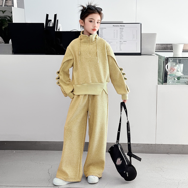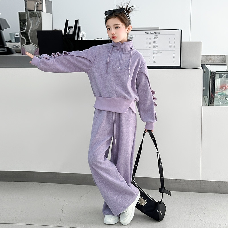 女童春款2025新款女大童春秋休闲半高领波浪袖卫衣阔腿裤运动套装