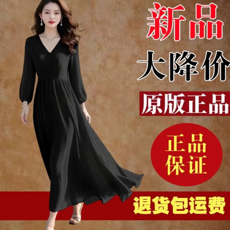 高档红色真丝雪纺连衣裙2025春秋长袖气质显瘦度假沙滩长款长裙女