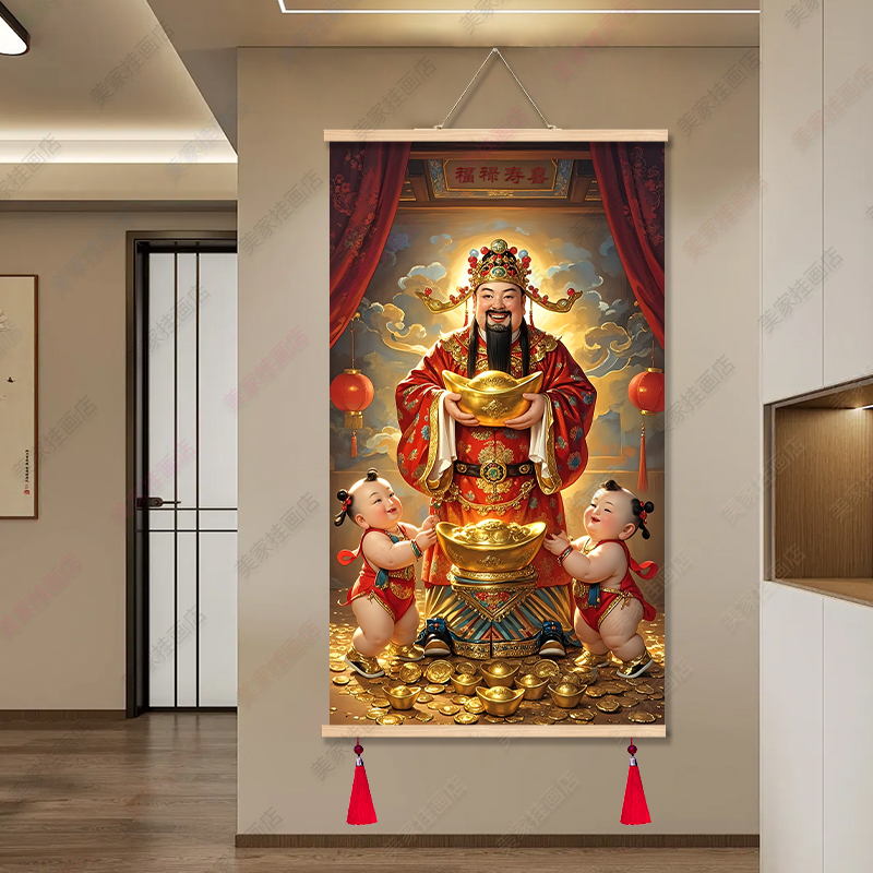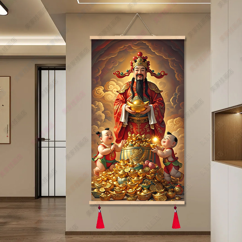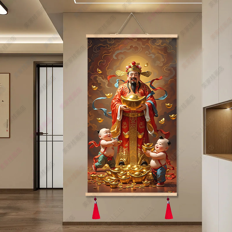新款财神爷中式玄关装饰餐厅饭店走廊进门招财开业挂画风水卷轴画