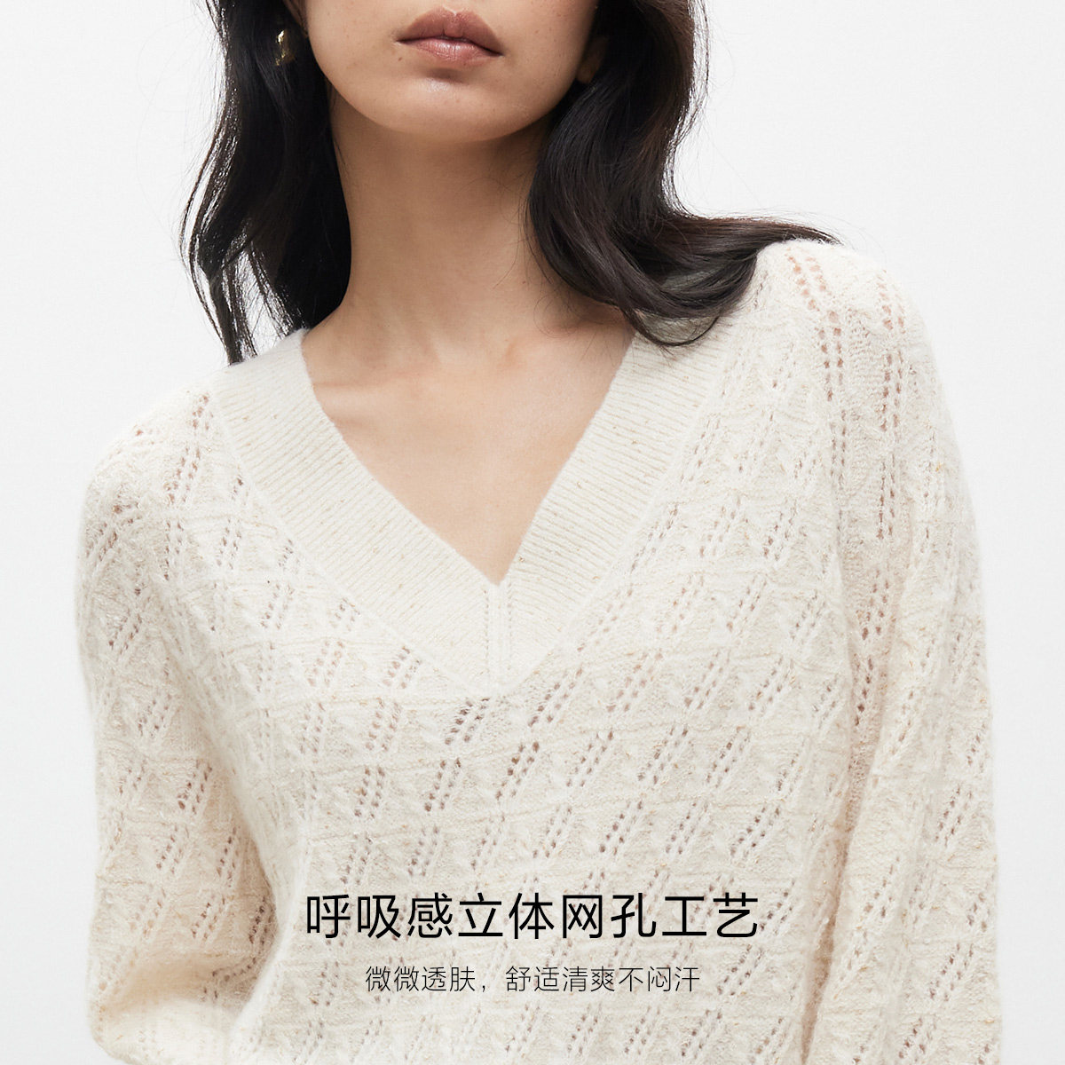ONLY2025秋冬新款软糯羊毛混纺V领复古亮丝网孔镂空毛衣针织衫女