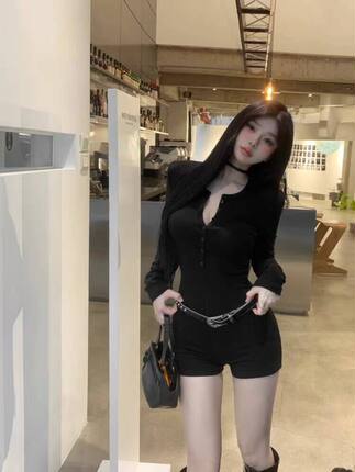 黑色纯欲风V领连体短裤女