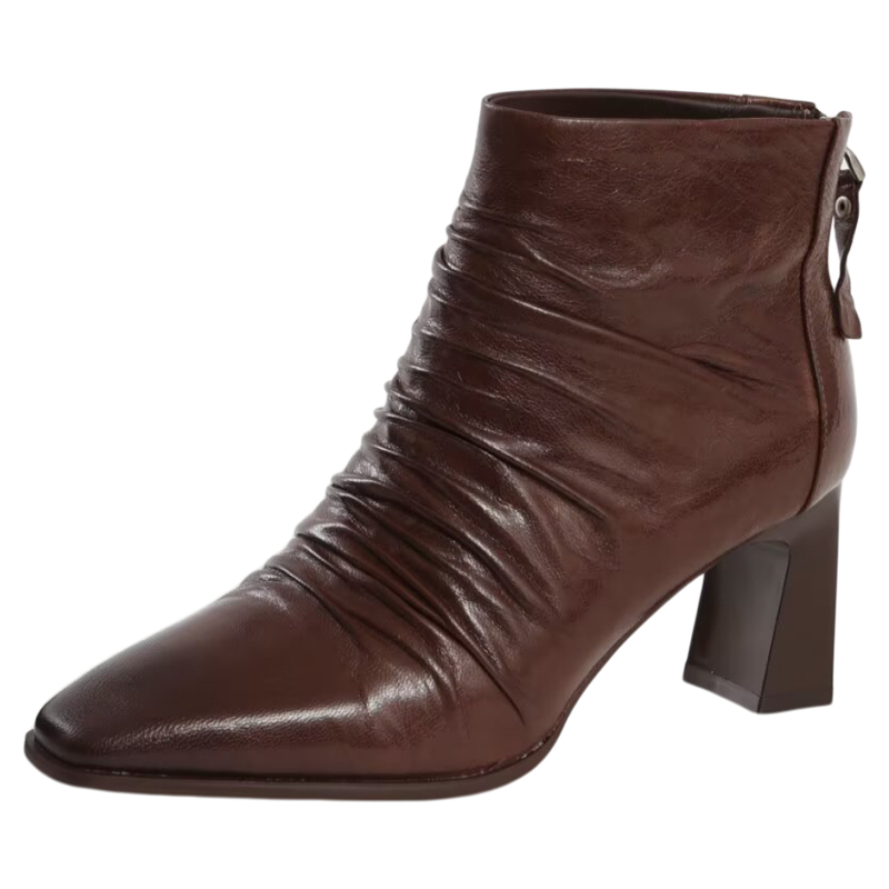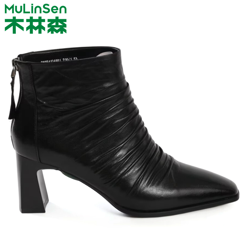 木林森女鞋2025冬季新款英伦短靴羊皮高跟后拉链尖头褶皱妈妈靴子