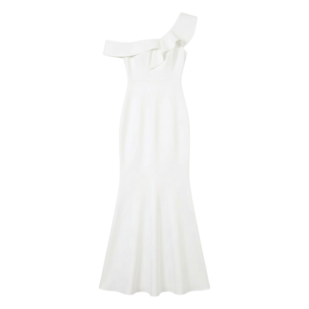 白色荷叶边一字领长款晚礼服