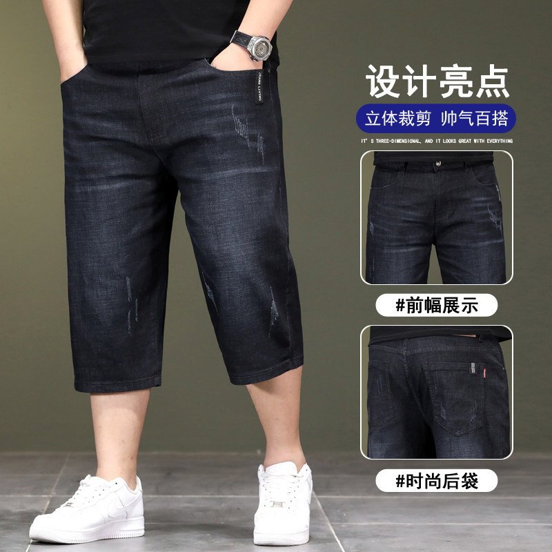 加肥加大码牛仔短裤男士七分中裤胖子肥佬弹力宽松直筒五分马裤子