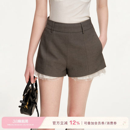 Kroche 26ss 浪漫邂逅 网纱花边拼接 简约休闲天丝羊毛A字短裤