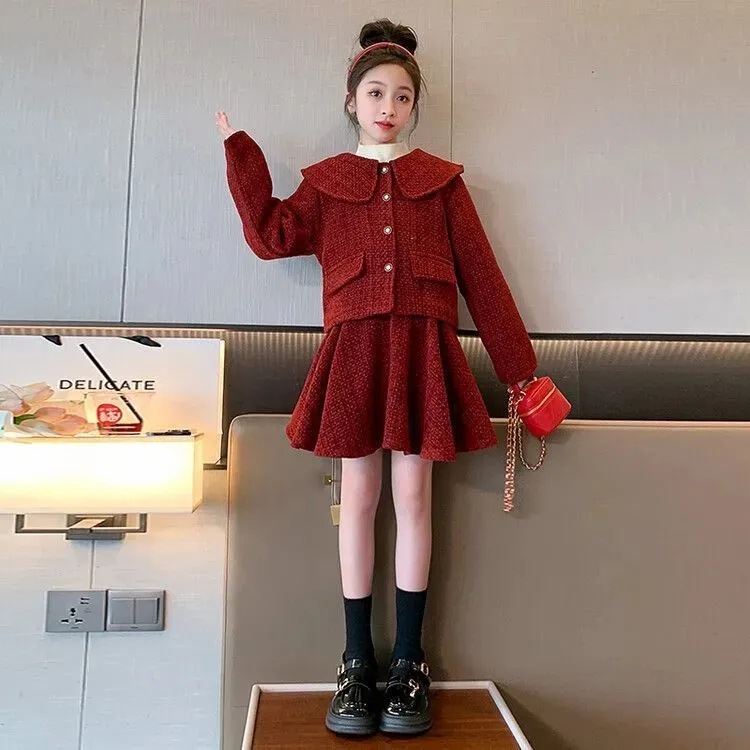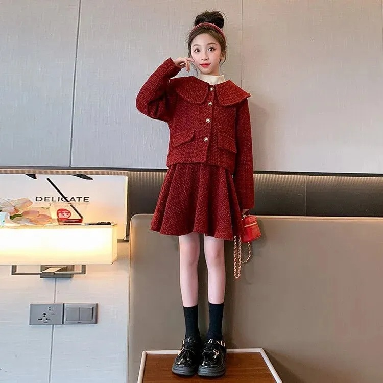 女童套装裙秋冬新款洋气时髦中大童加厚拜年衣服小香风外套