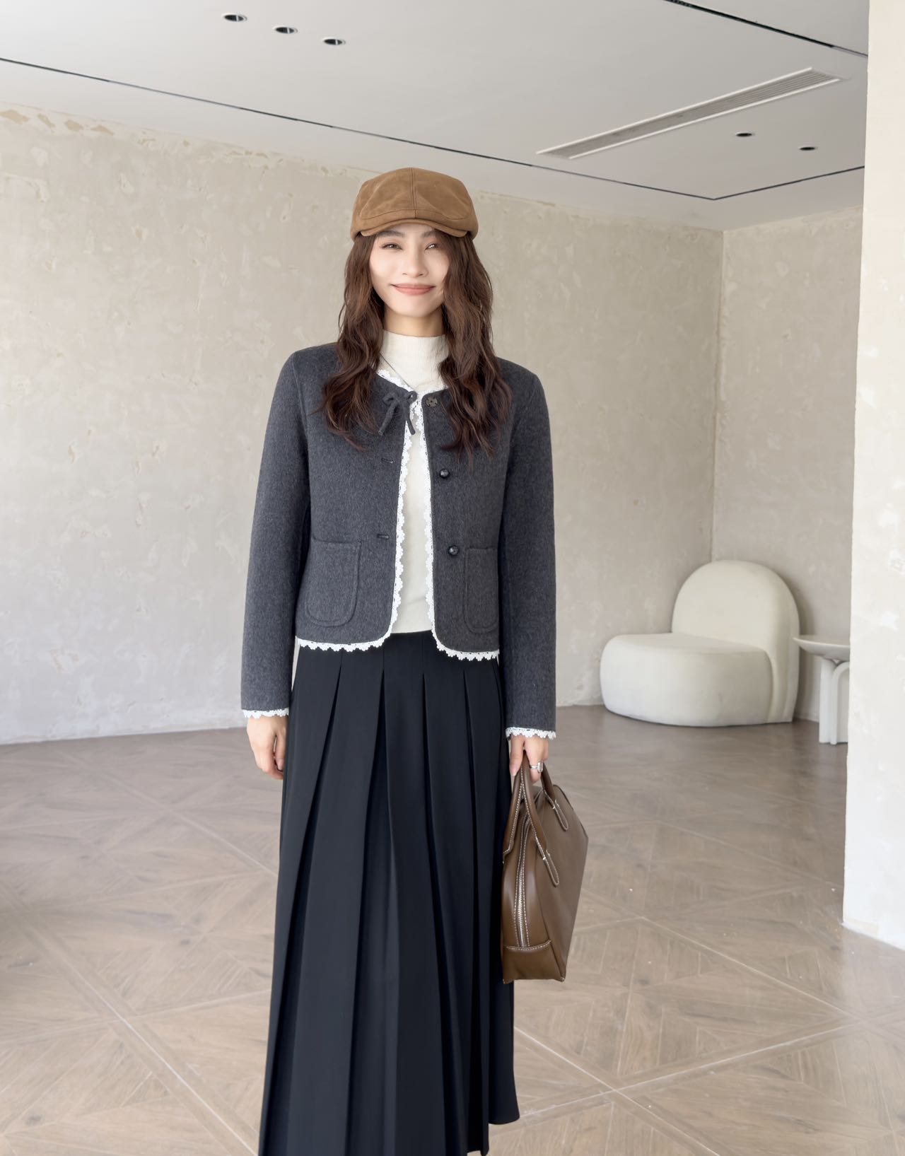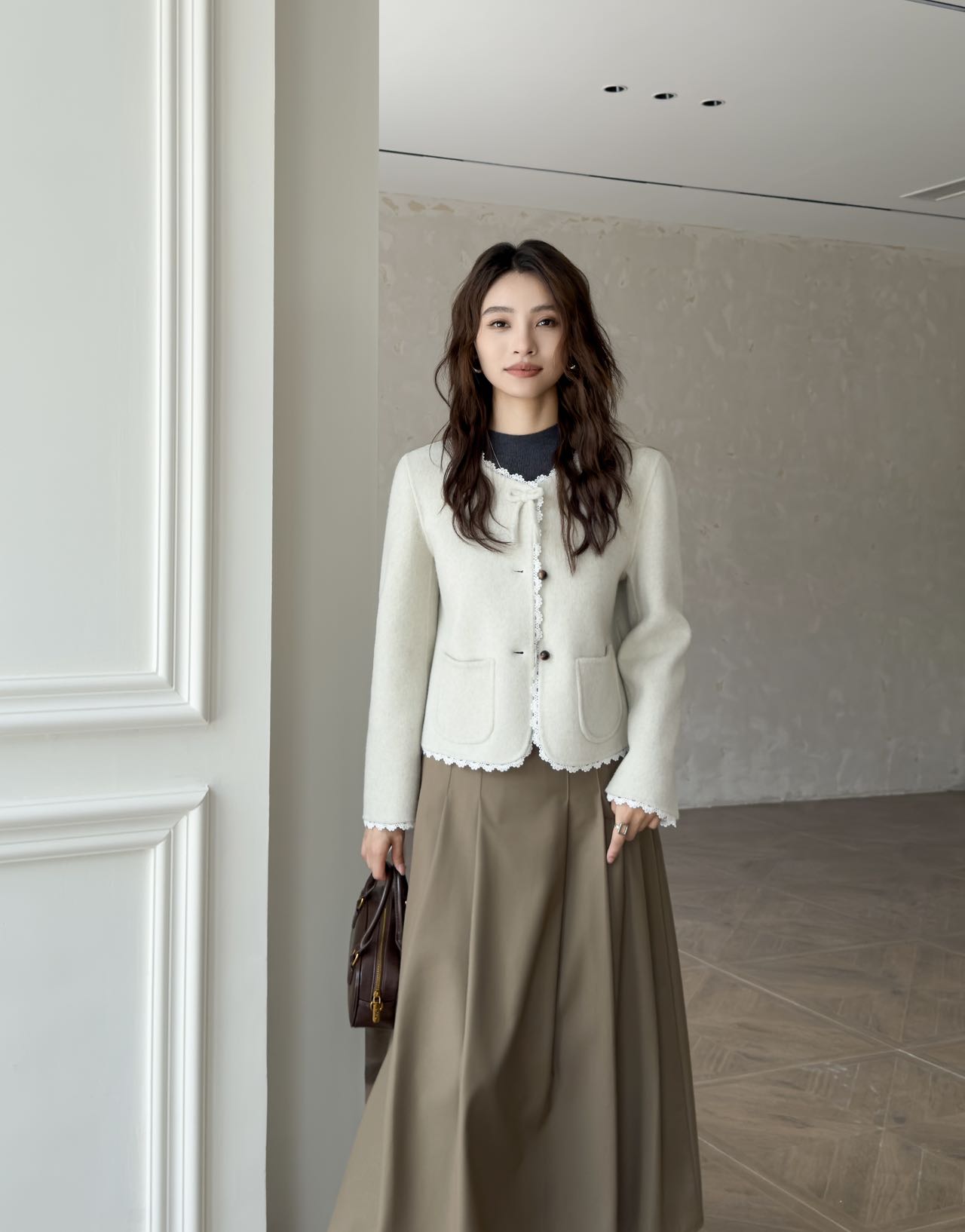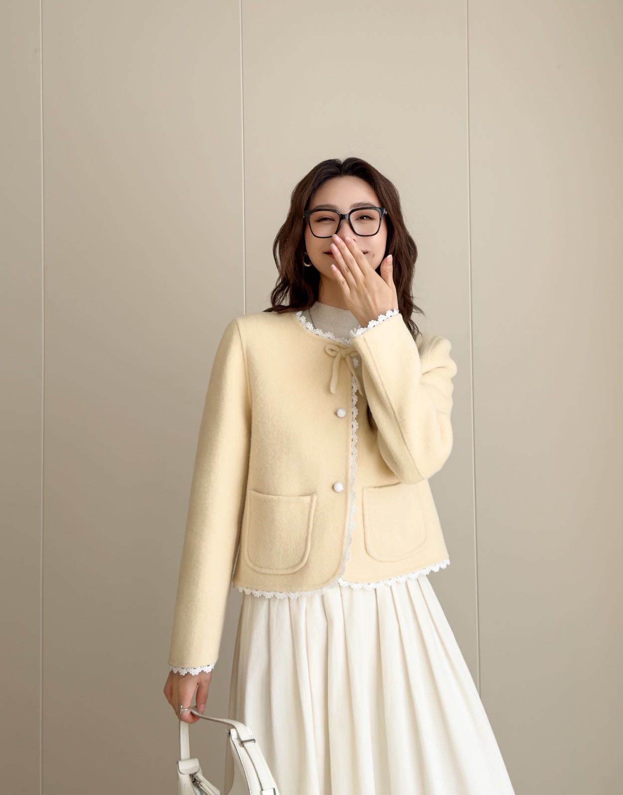 韩国定制短款双面羊绒大衣小香风蕾丝花边温柔系羊毛呢开衫外套