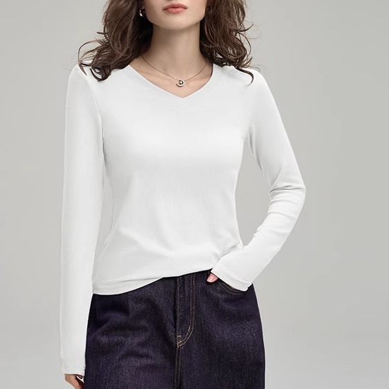 高街美式白色V领正肩t恤2025秋季新款高端女士长袖修身显瘦打底衫