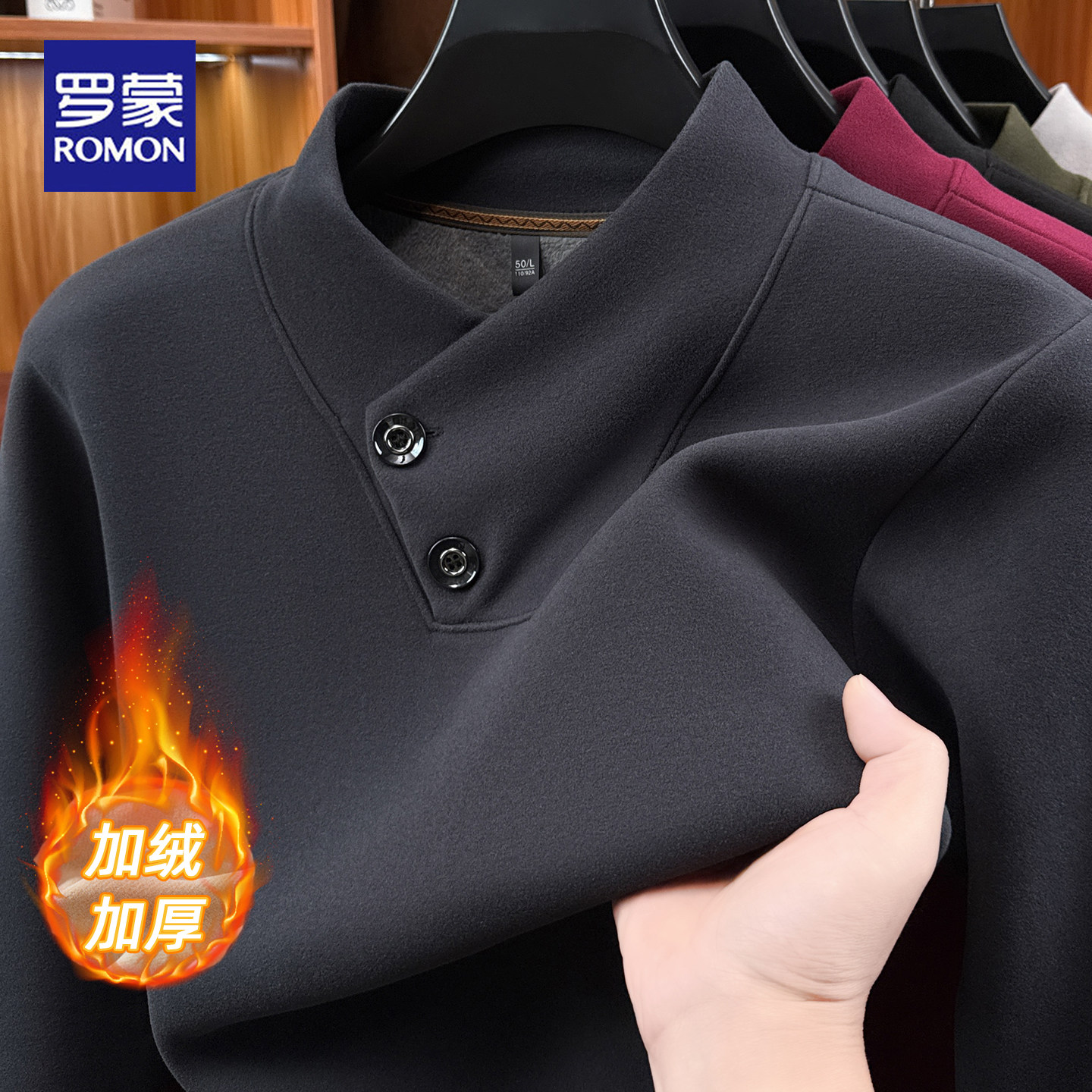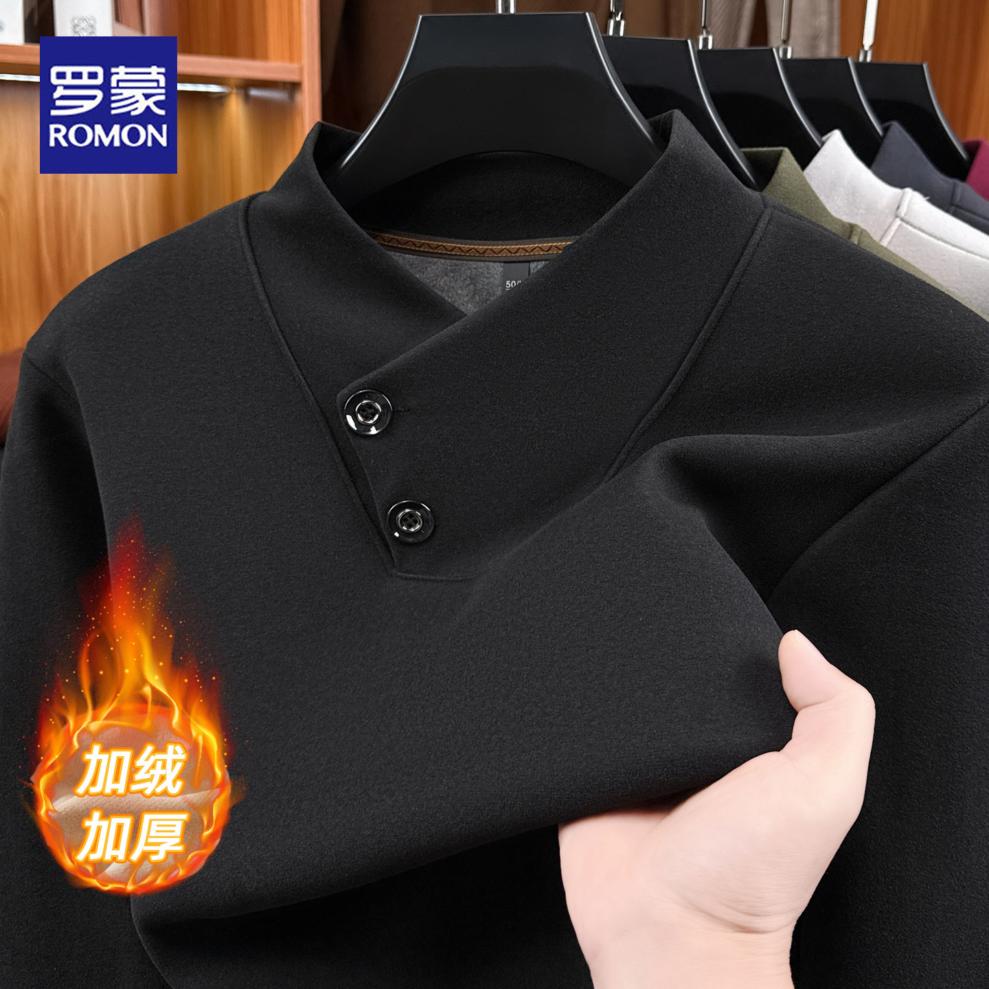 罗蒙冬季男士围巾领两粒扣卫衣加绒加厚保暖中年商务休闲打底衫男