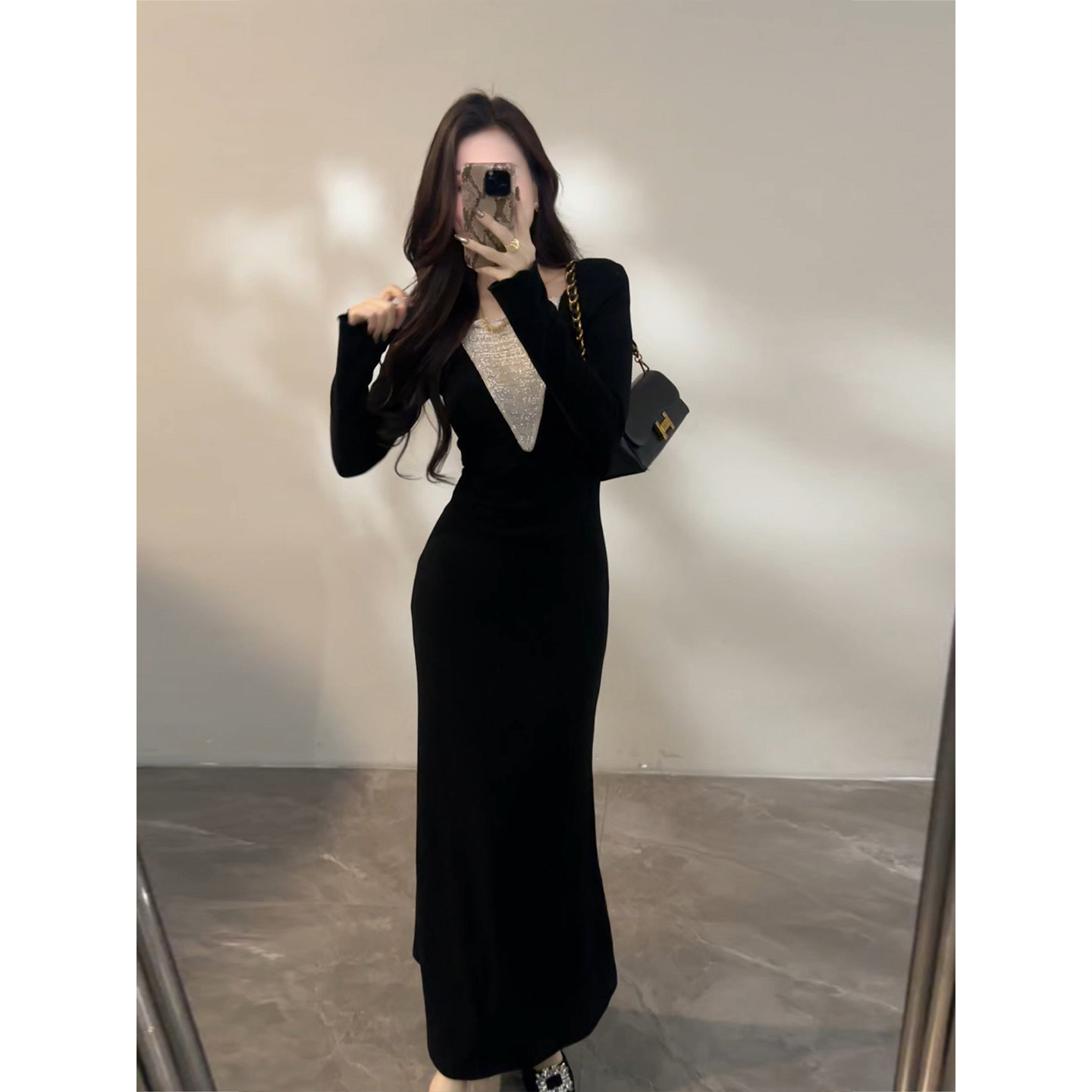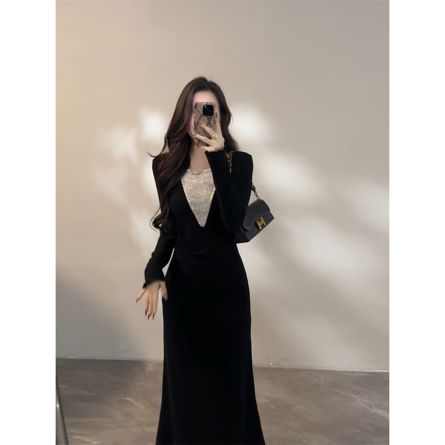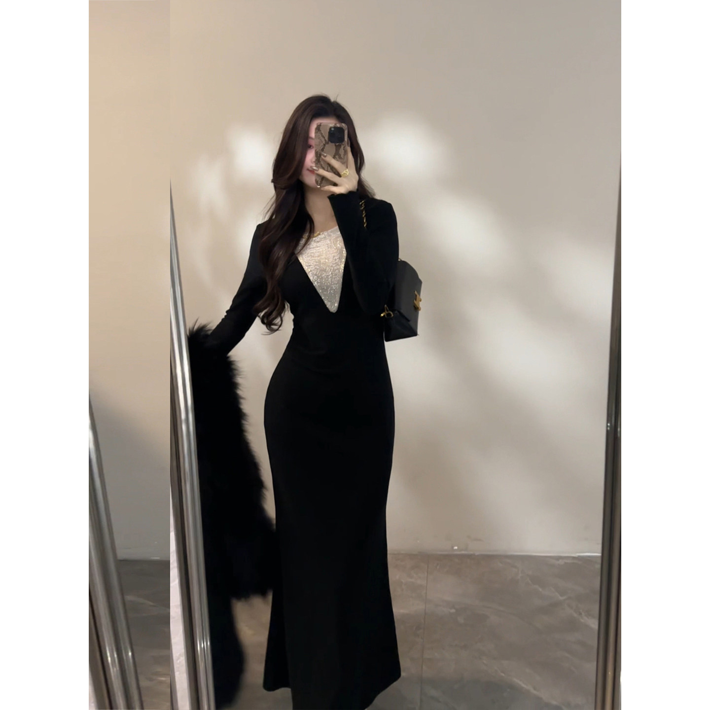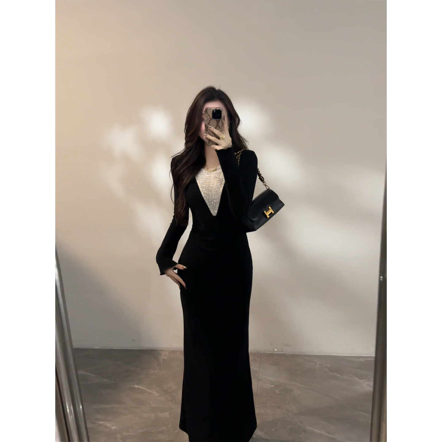 大婷婷 冬季新款轻奢名媛长袖抽褶收腰包臀鱼尾连衣裙DT1756
