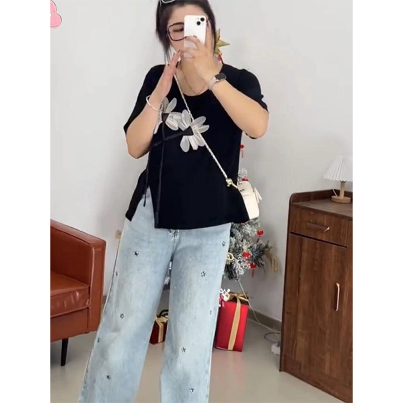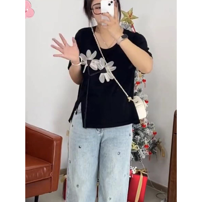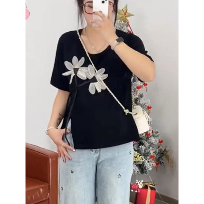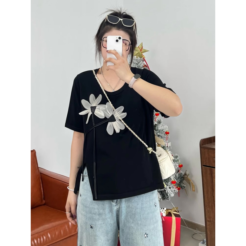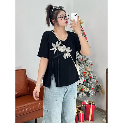 300斤大码女装黑色设计感开叉短袖T恤女夏季胖mm显瘦宽松打底上衣