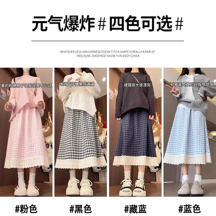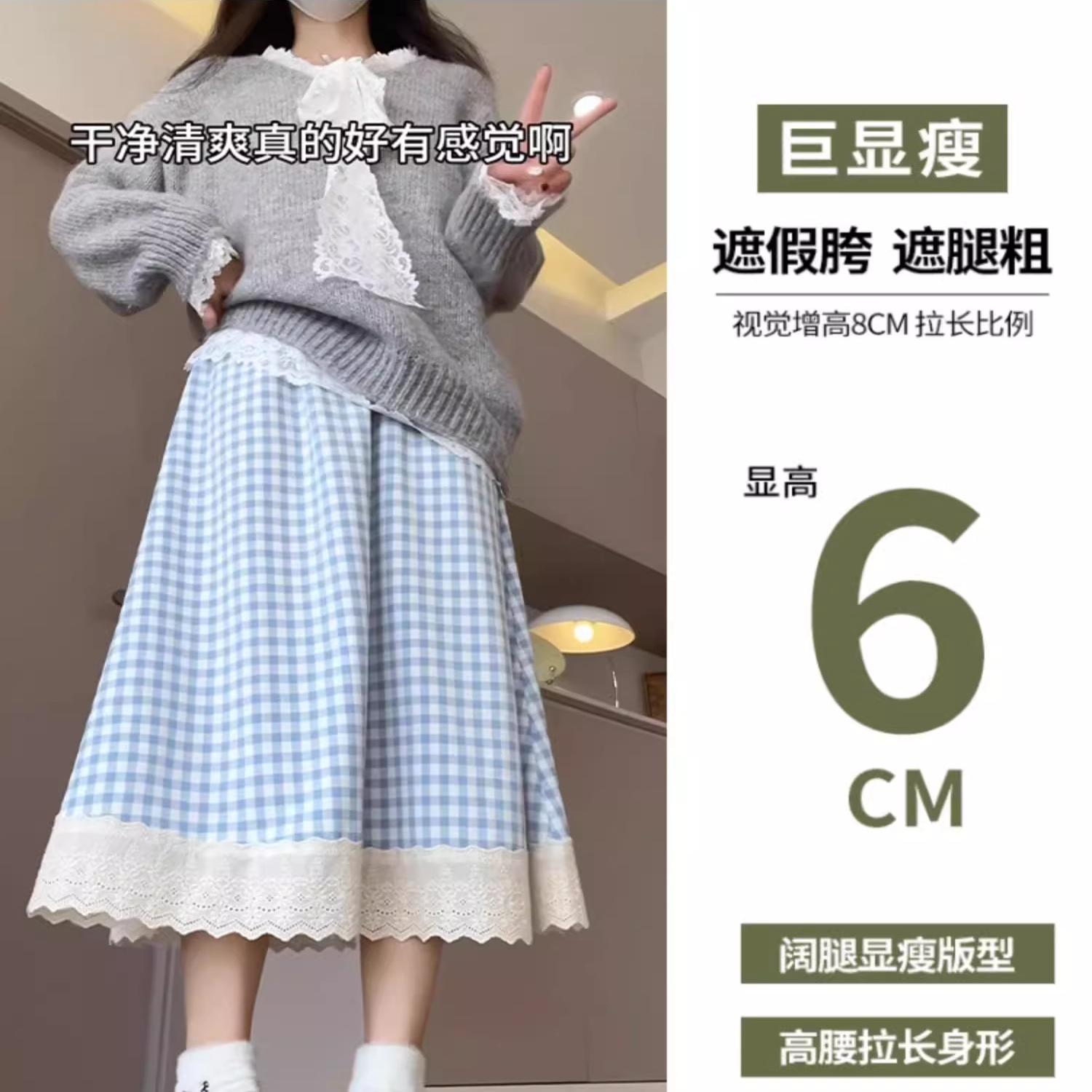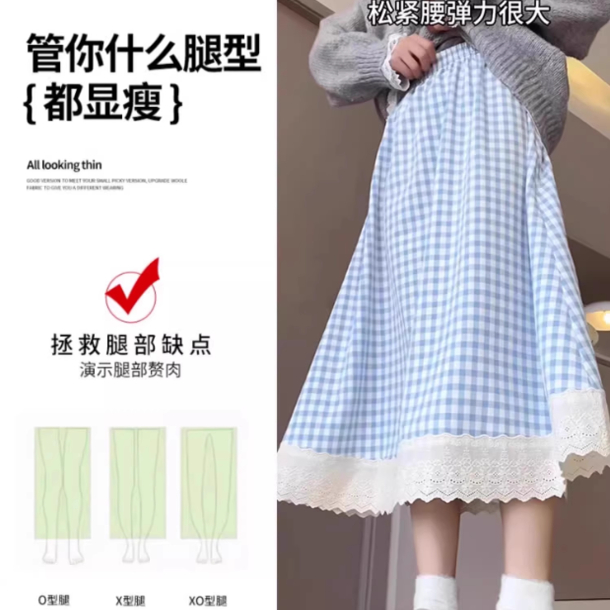 蓝色蕾丝花边格子半身裙女中长款夏季2025新款高腰显瘦a字裙伞裙