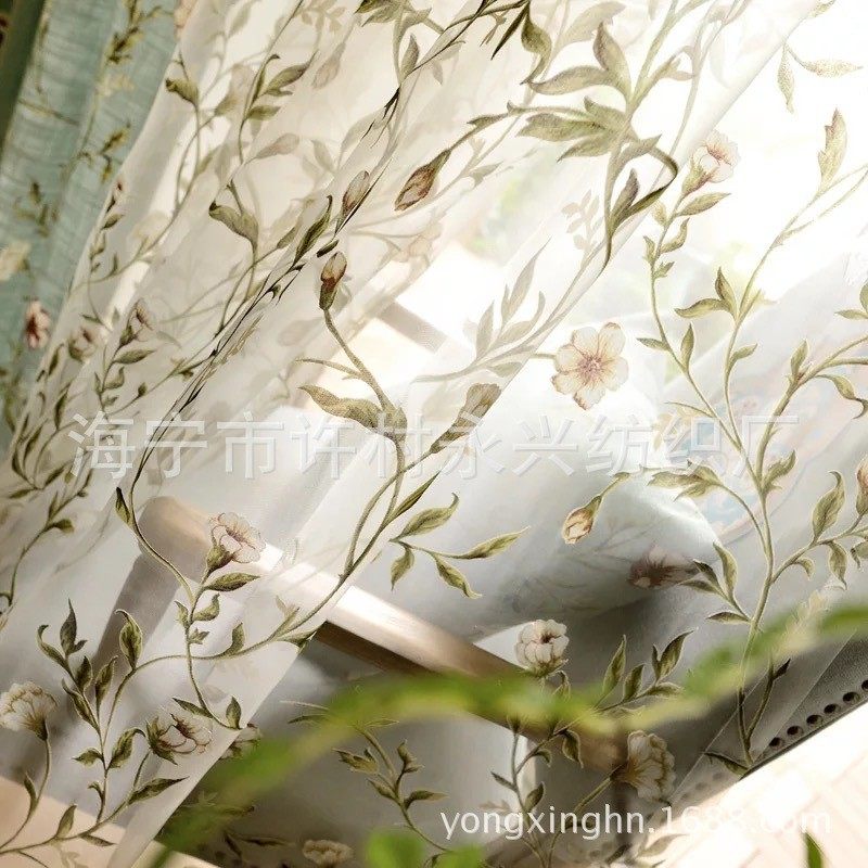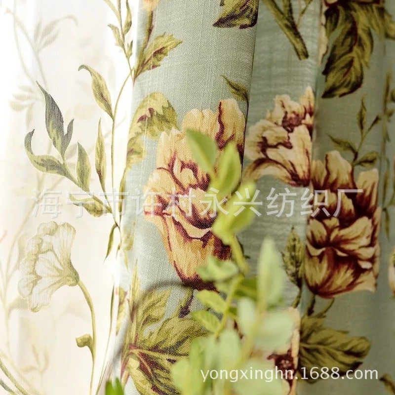 美式田园大花碎花棉麻印花卧室客厅成品窗帘布料窗纱复古蓝绿色