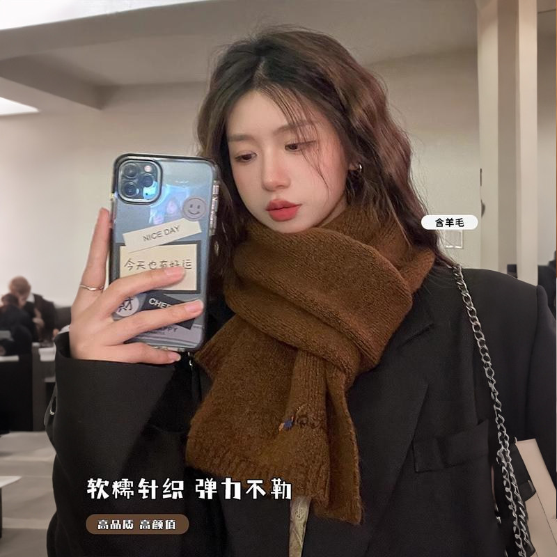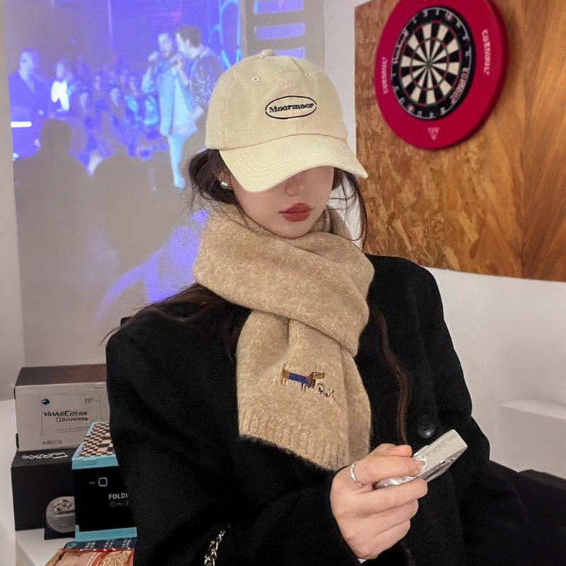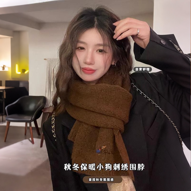 韩系氛围感小狗刺绣含羊绒围巾女2025新款秋冬季保暖针织毛线围脖