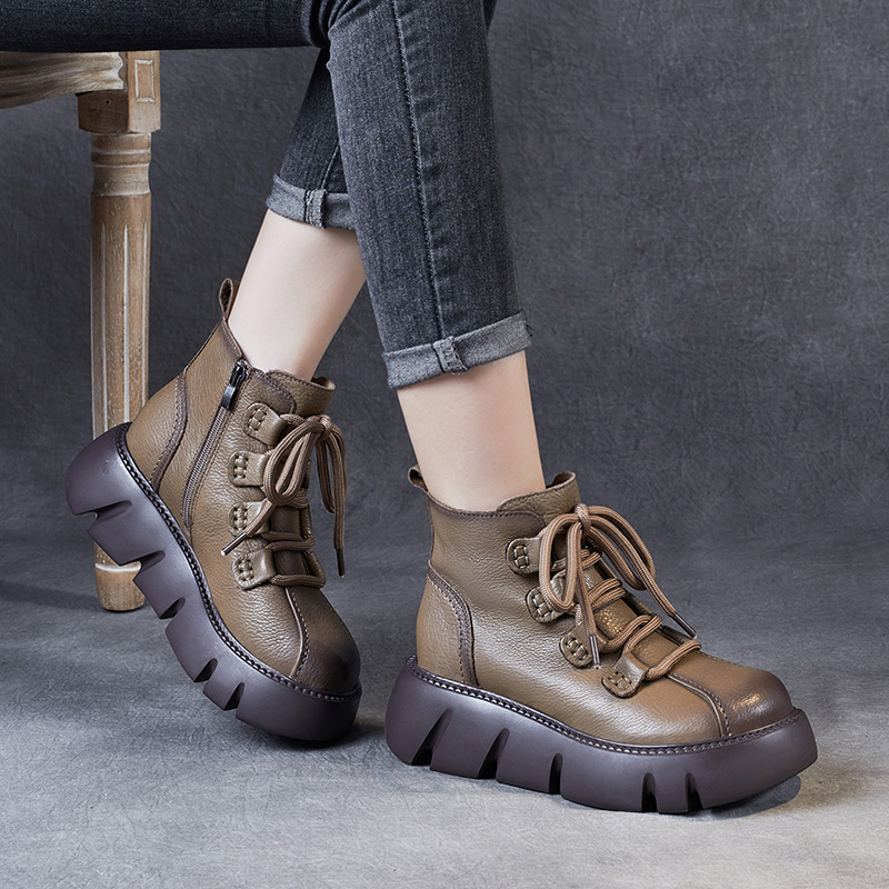 真皮小个子厚底增高马丁靴秋款松糕平跟短靴牛皮复古系带短筒女鞋
