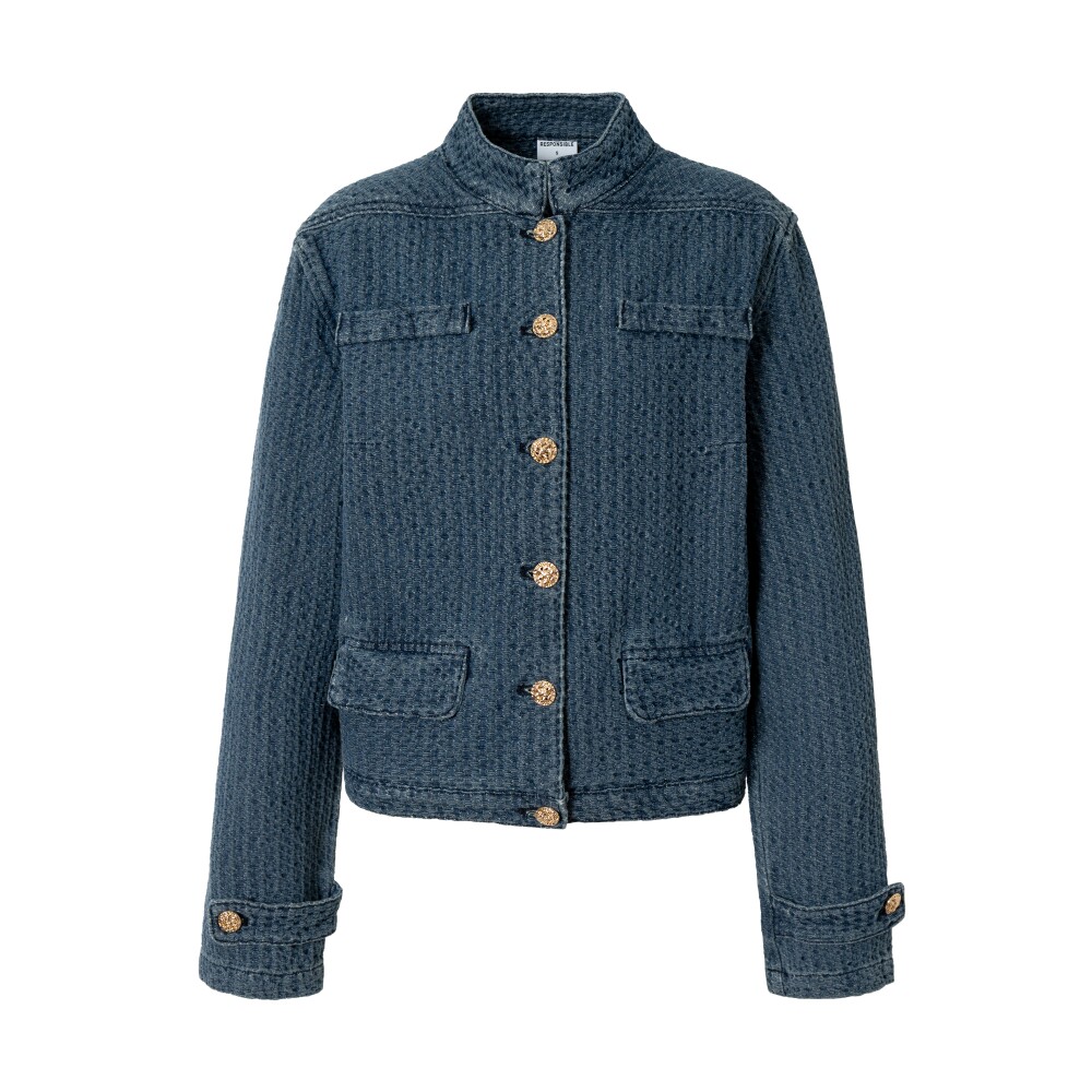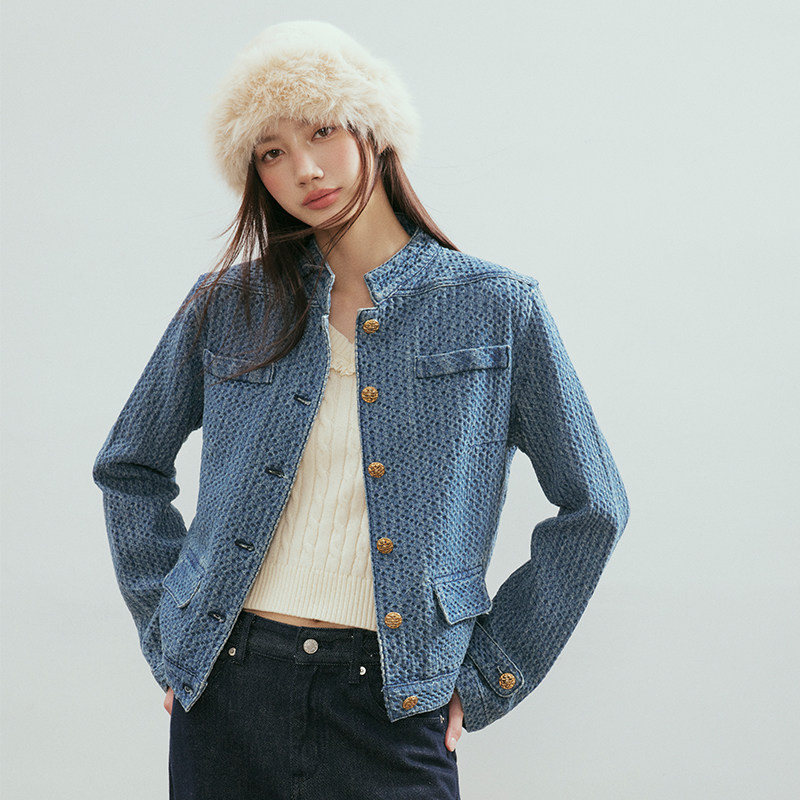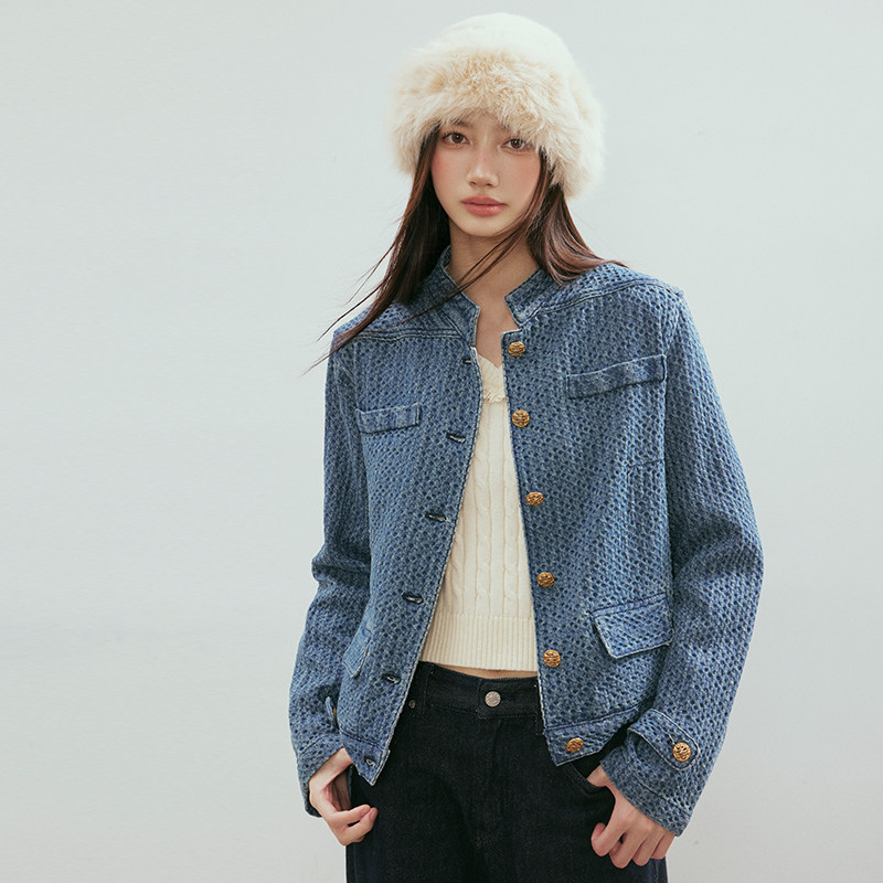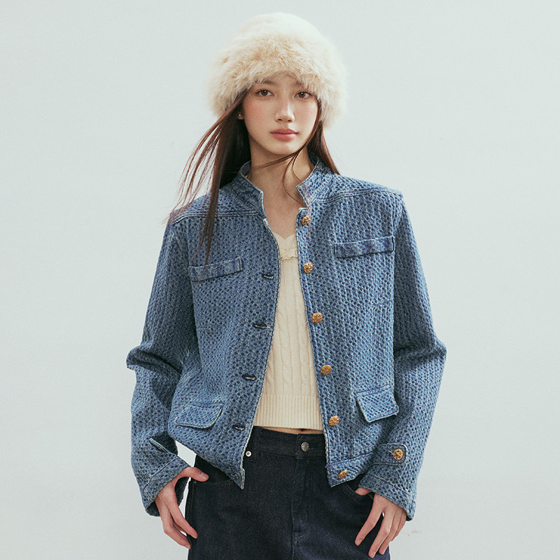 RPB BRAND 肌理感牛仔外套女小香风立领短款复古单排扣夹克上衣
