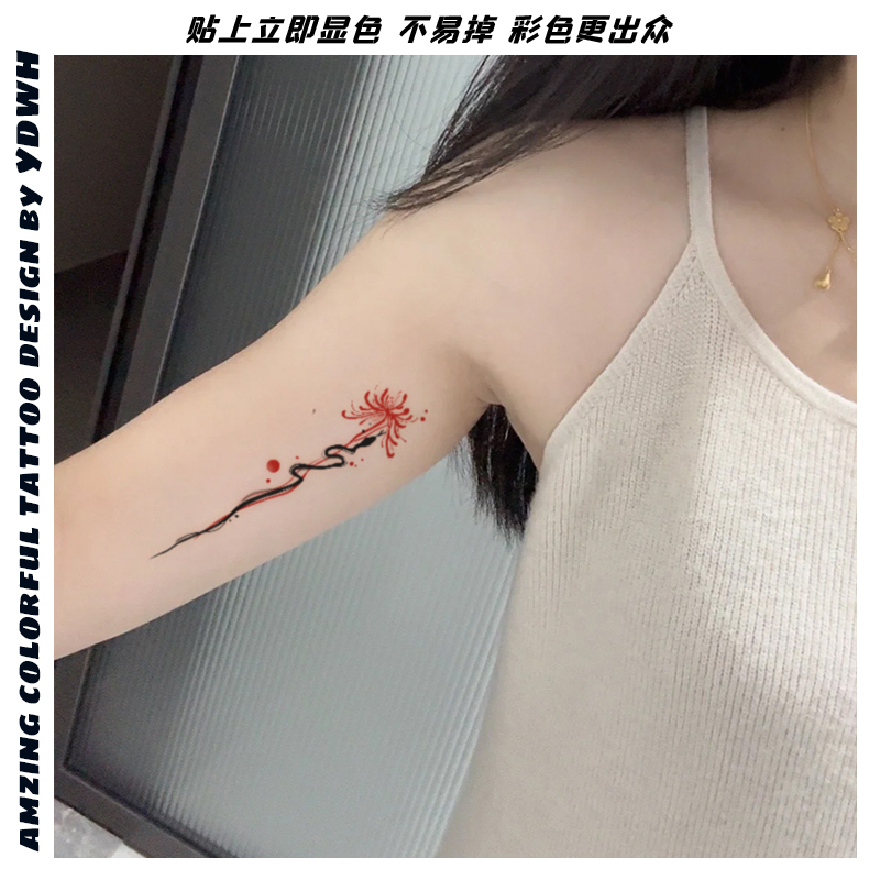 彼岸花小蛇纹身贴防水女持久手背脖子贴纸遮盖疤痕tattoo高级感