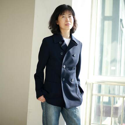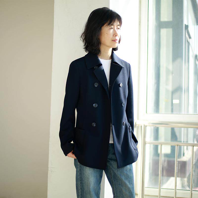 深蓝色双排扣风衣抗皱弹力针织修身无垫肩单层休闲西装外套女春秋