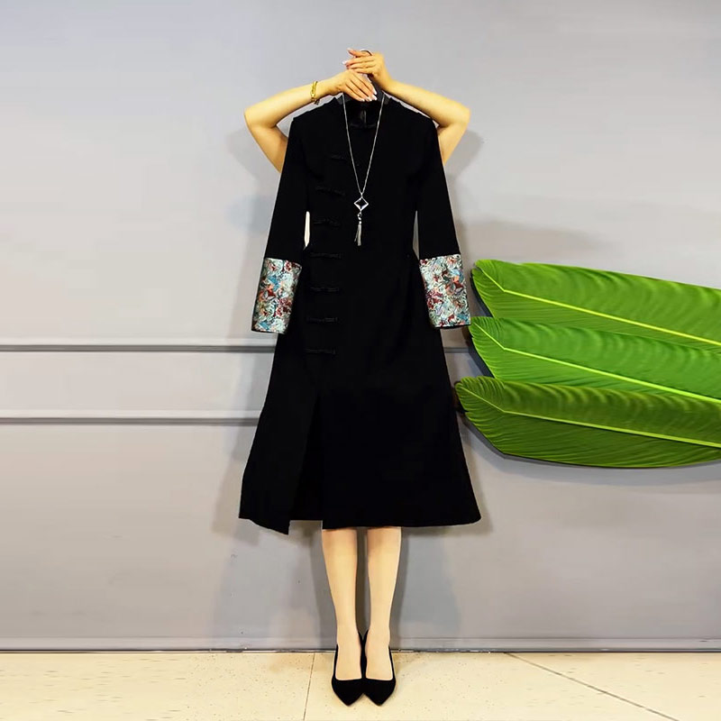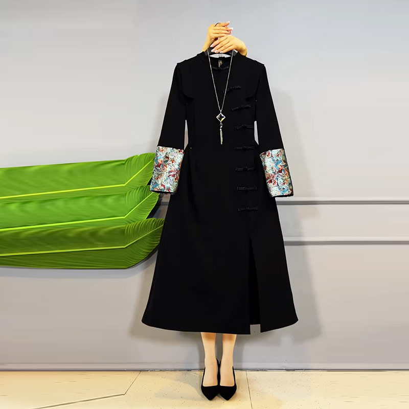 加大码女装拼接撞色长袖时尚显瘦复古风改良旗袍裙加肥盘扣连衣裙