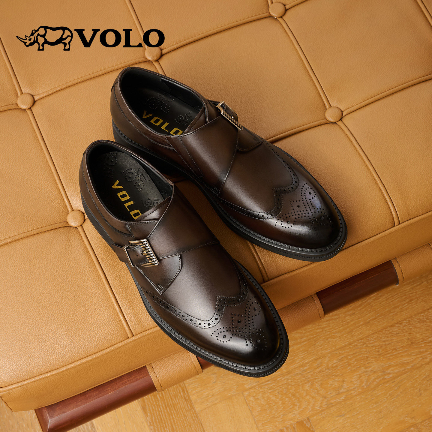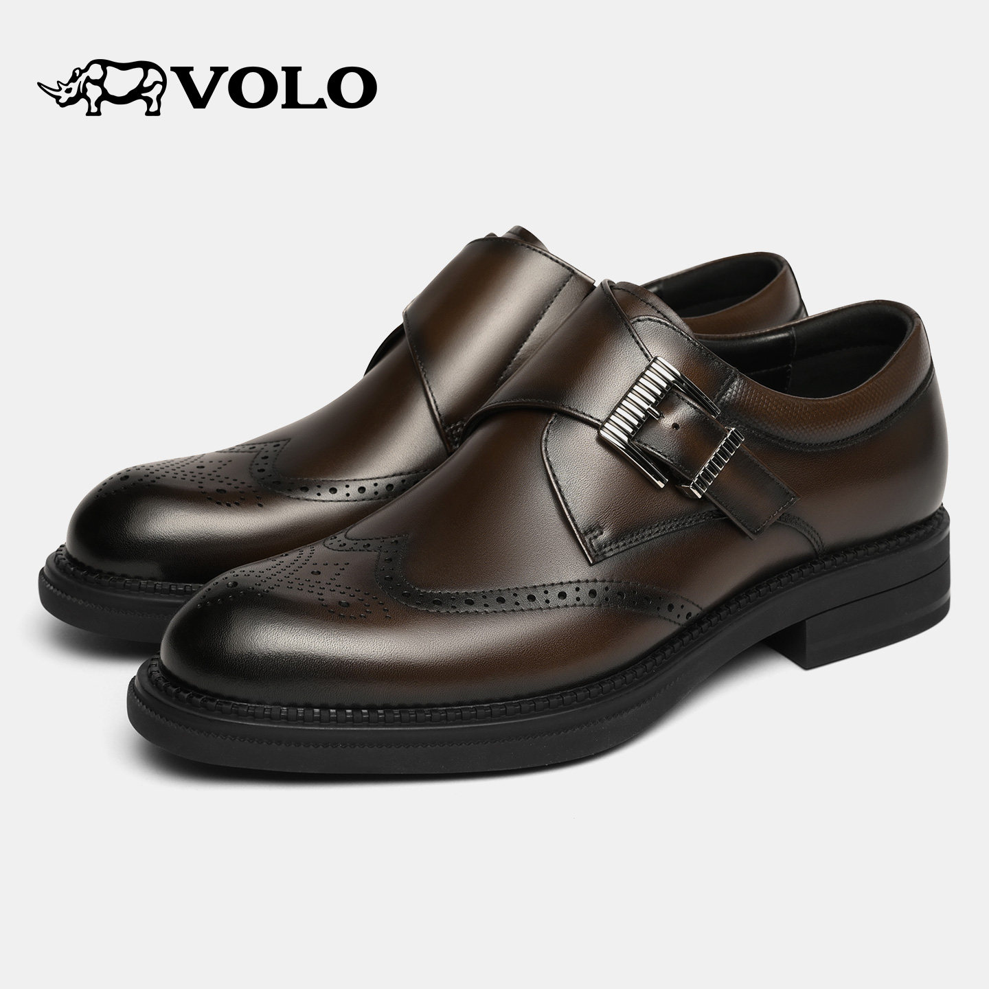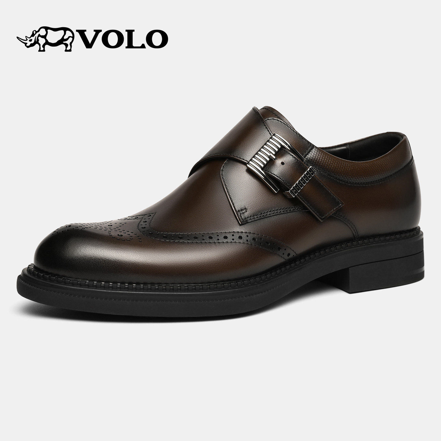 VOLO犀牛男士皮鞋男正装商务2025新款冬布洛克男鞋真皮雕花孟克鞋