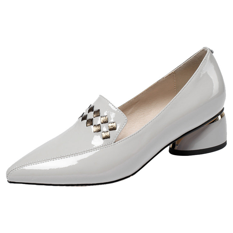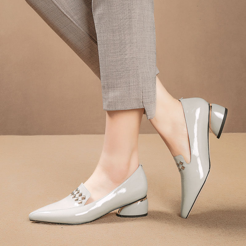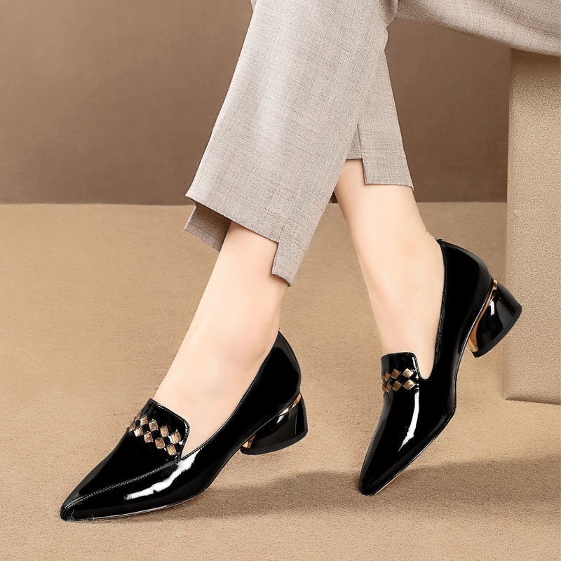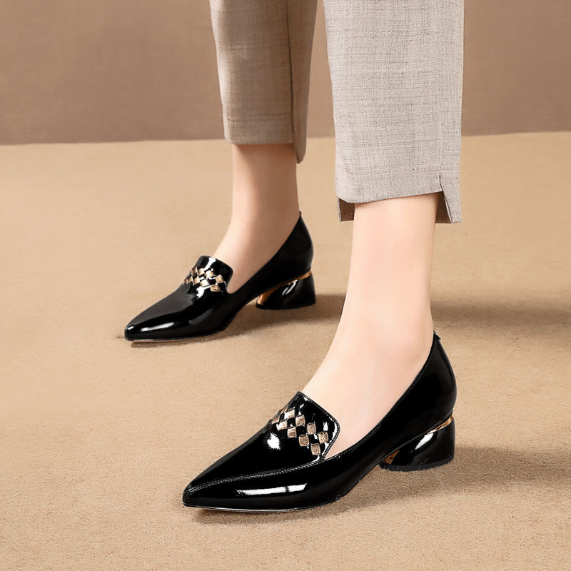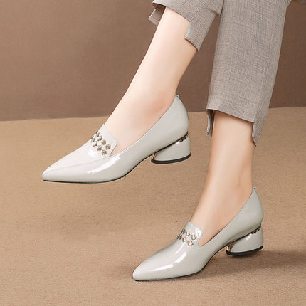 思卡琪春秋新款尖头单鞋女中跟百搭粗跟漆皮真皮时尚舒适大码女鞋